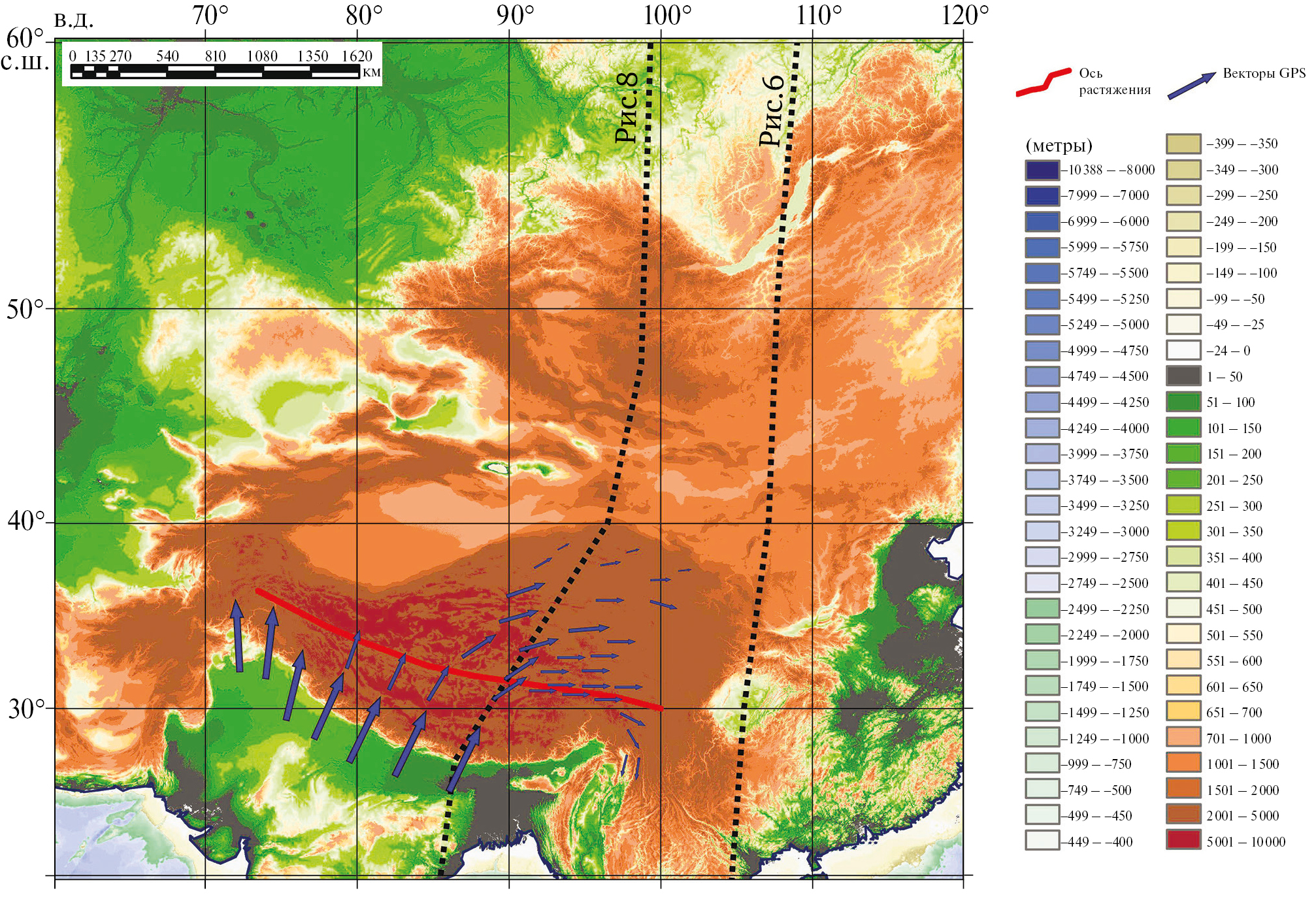 Гималайская дуга является современной коллизионной границей Индостана и Евразийской плиты. Поле векторов GPS в районе дуги имеет веерообразный разворот от ~355o на западе дуги до ~30o на востоке с общей северной направленностью движения приповерхностных блоков [27, 22] (см. рис. 9).