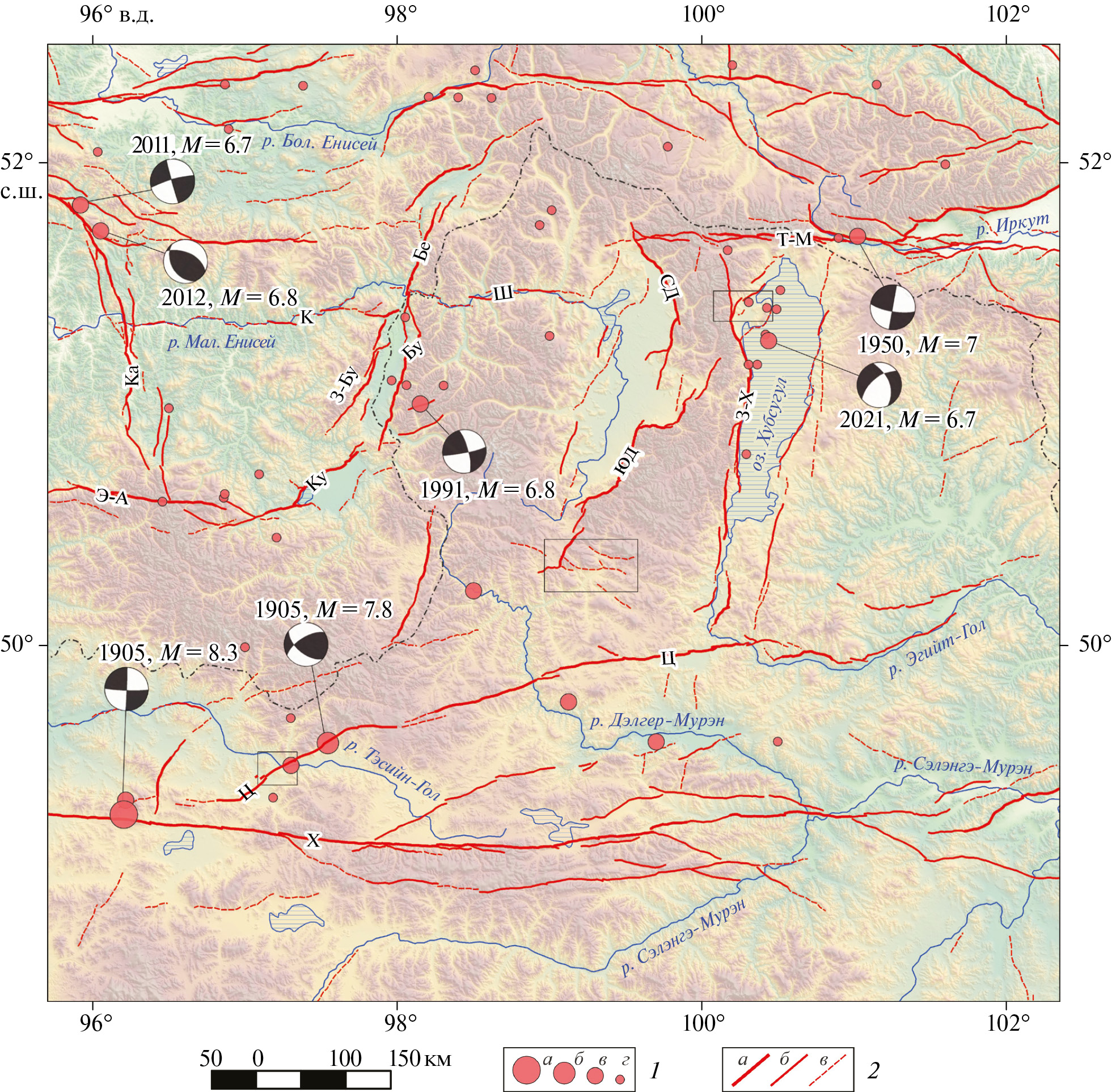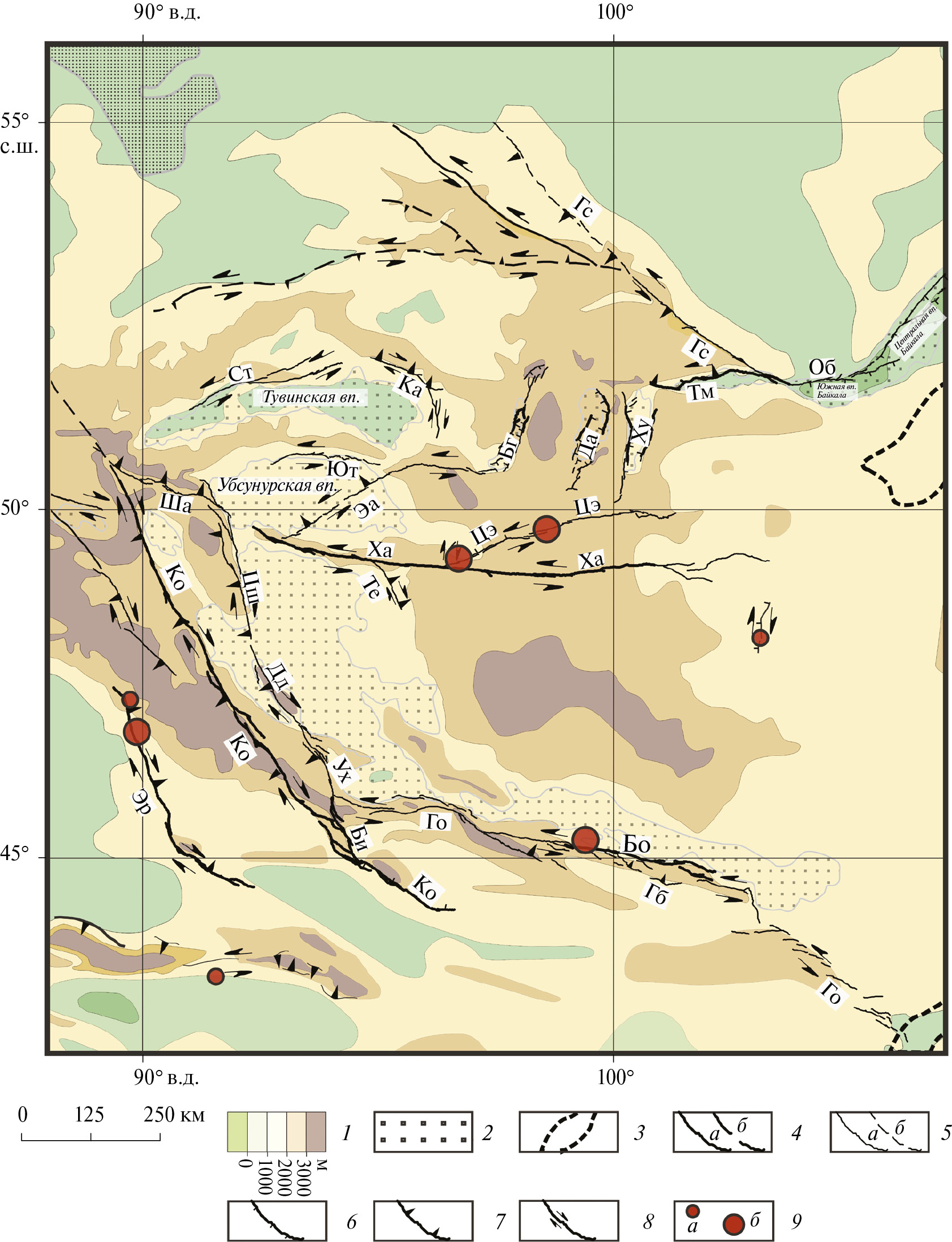 Активные разломы: Би ‒ Бидж, Бо ‒ Богд, Гб ‒ Гурван-Булаг, Гс ‒ Главный Саянский, Дд ‒ Дзун-Джиргалант, Ко ‒ Кобдинский, Об ‒ Обручевский, Ст ‒ Саяно-Тувинский, Те ‒ Терегтийнский, Ух ‒ Умусин-Хайрханский, Ха ‒ Хангайский, Цш ‒ Цаган-Шибетинский, Цэ ‒ Цэцэрлэгский, Ша ‒ Шаптальский, Эа ‒ Эрзин-Агардагский, Эр ‒ Эртайский, Ют ‒ Южно-Таннуольский;