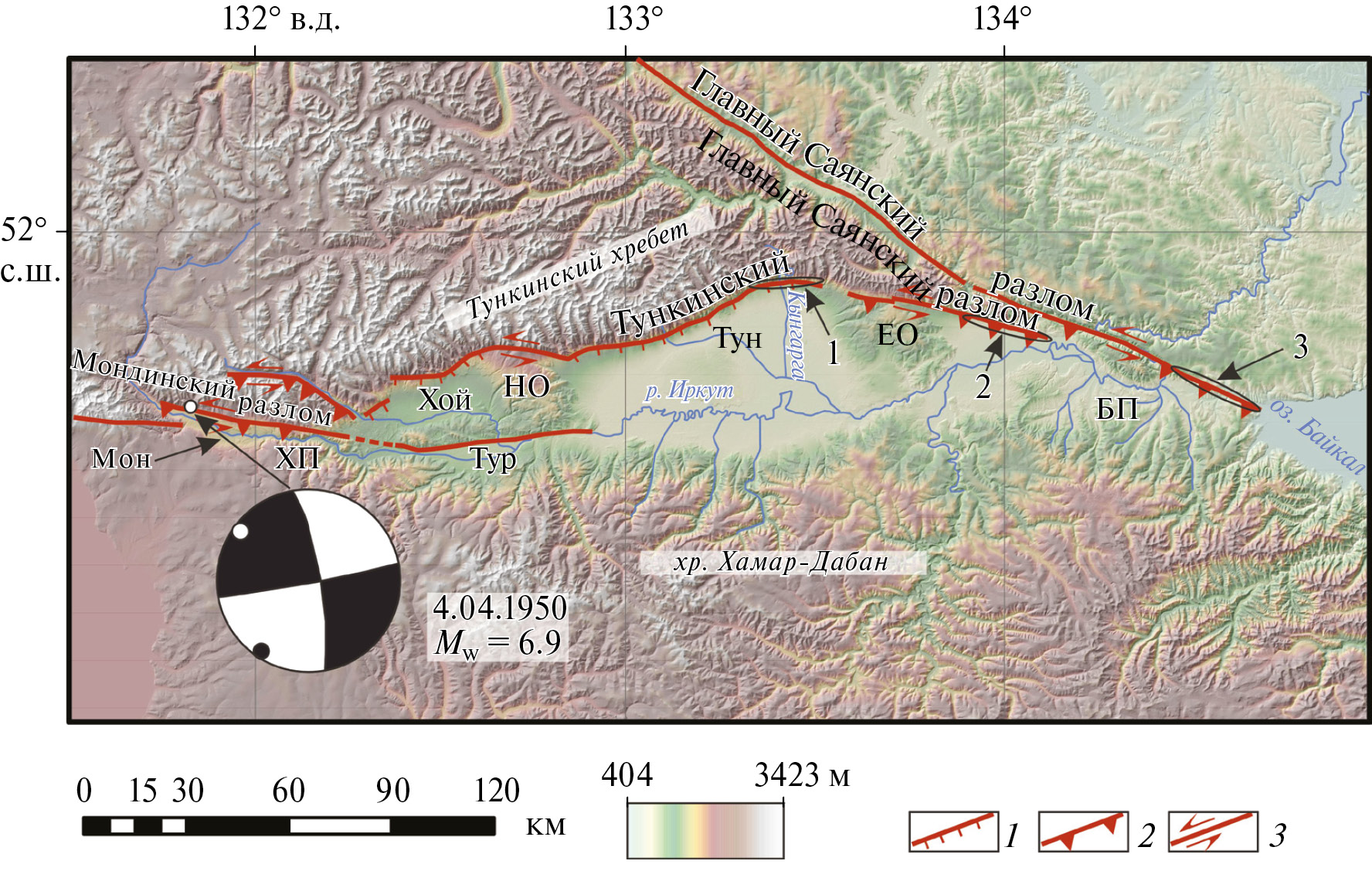 В зоне Хангайского разлома произошло сильнейшее Болнайское землетрясение 23.07.1905 г. (Ms ≥ 8) [23, 36, 37]. Эпицентр землетрясения располагался вблизи причленения Терегтийнского разлома к Хангайскому, сейсмогенное перемещение распространялось вдоль Хангайского разлома билатерально, более к востоку, чем к западу [64] (рис. 3).