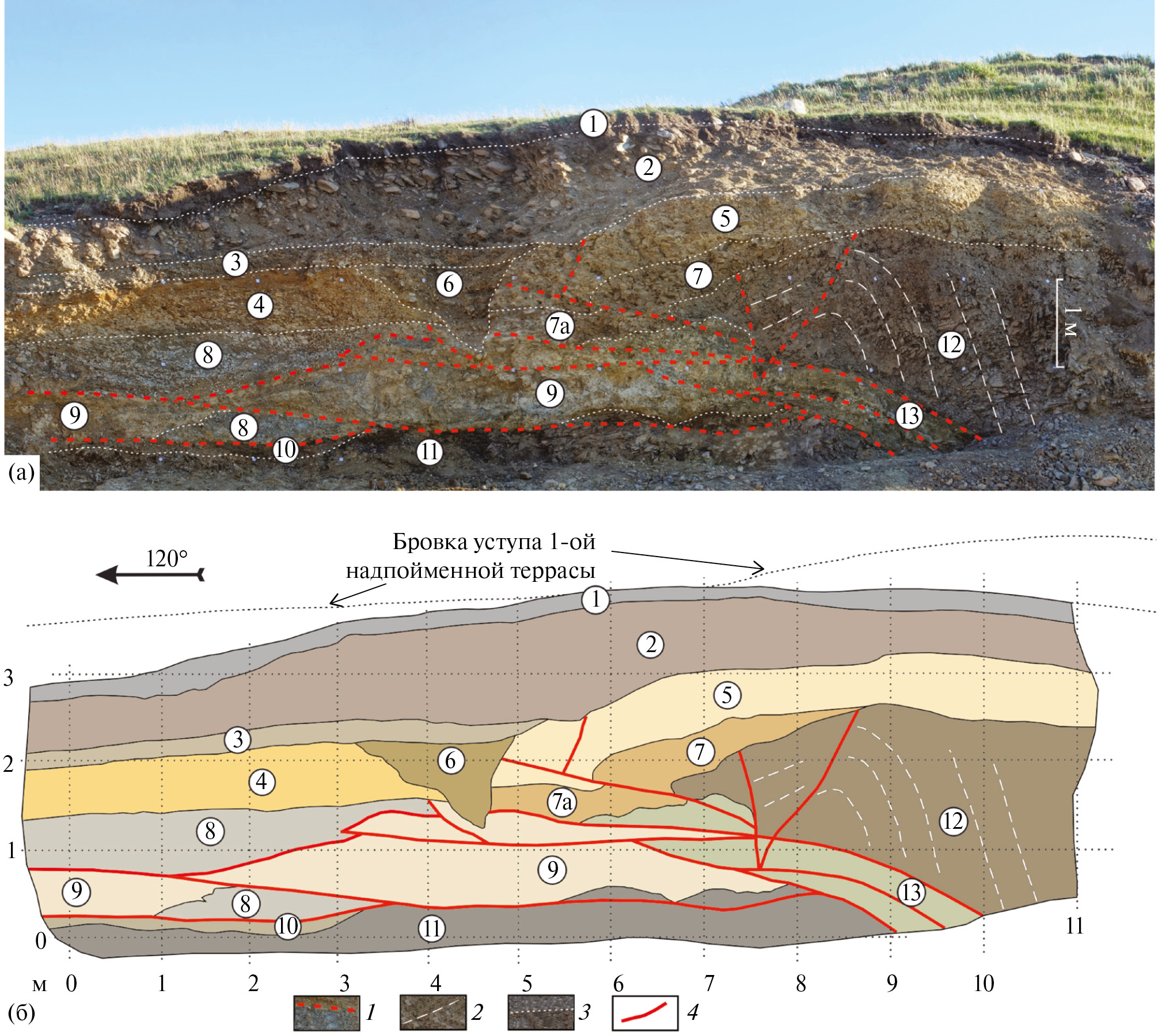 1 – современная почва; 2 – песчано-глинистые отложения; 3 – то же с галькой и щебнем; 4 – щебень; 5 – корреляция слоев: а – достоверная, б – предполагаемая; 6 – места отбора и номера радиоуглеродных проб