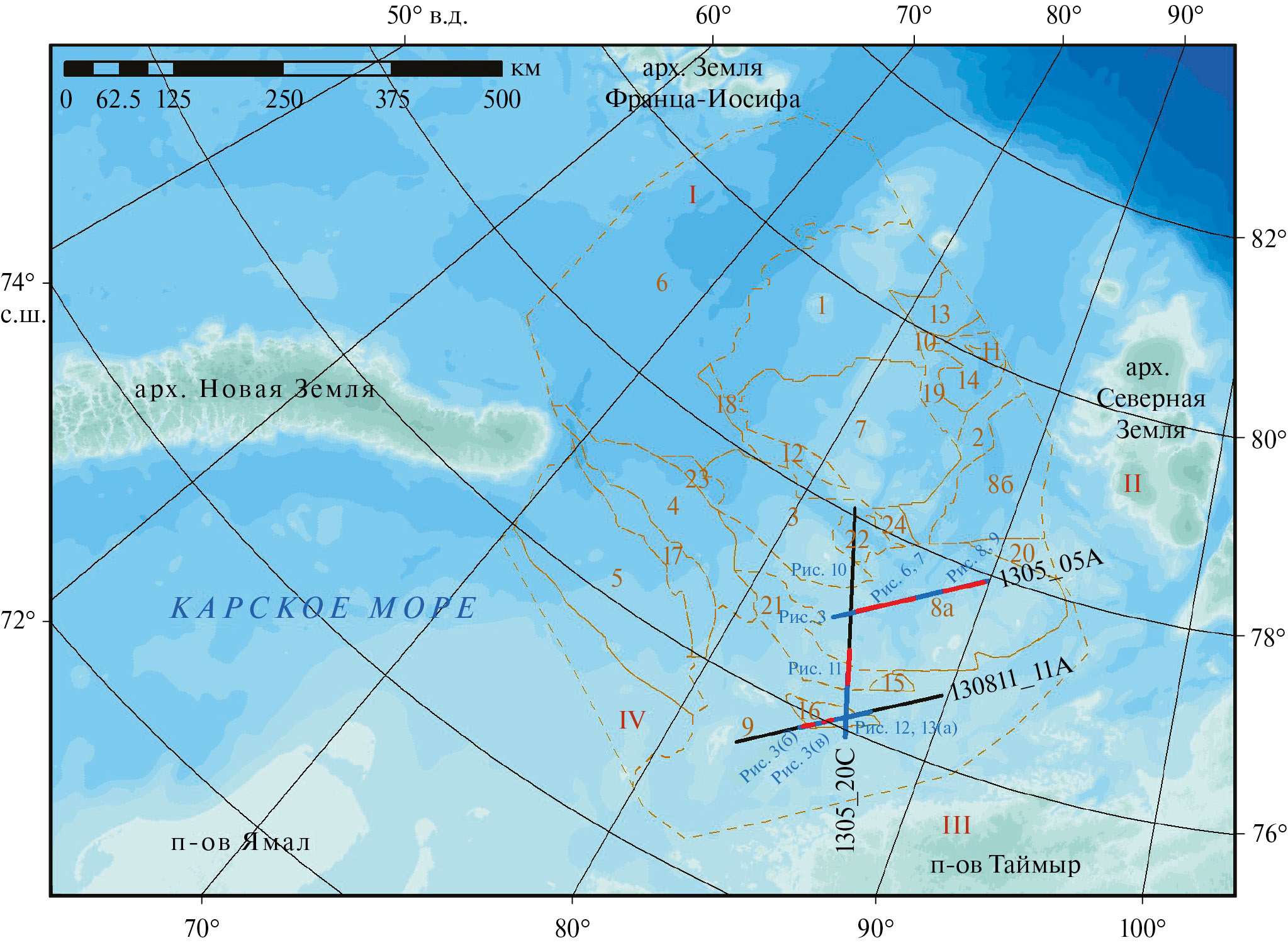 Рис. 2. Положение сейсмических профилей на Притаймырском шельфе Карского моря.