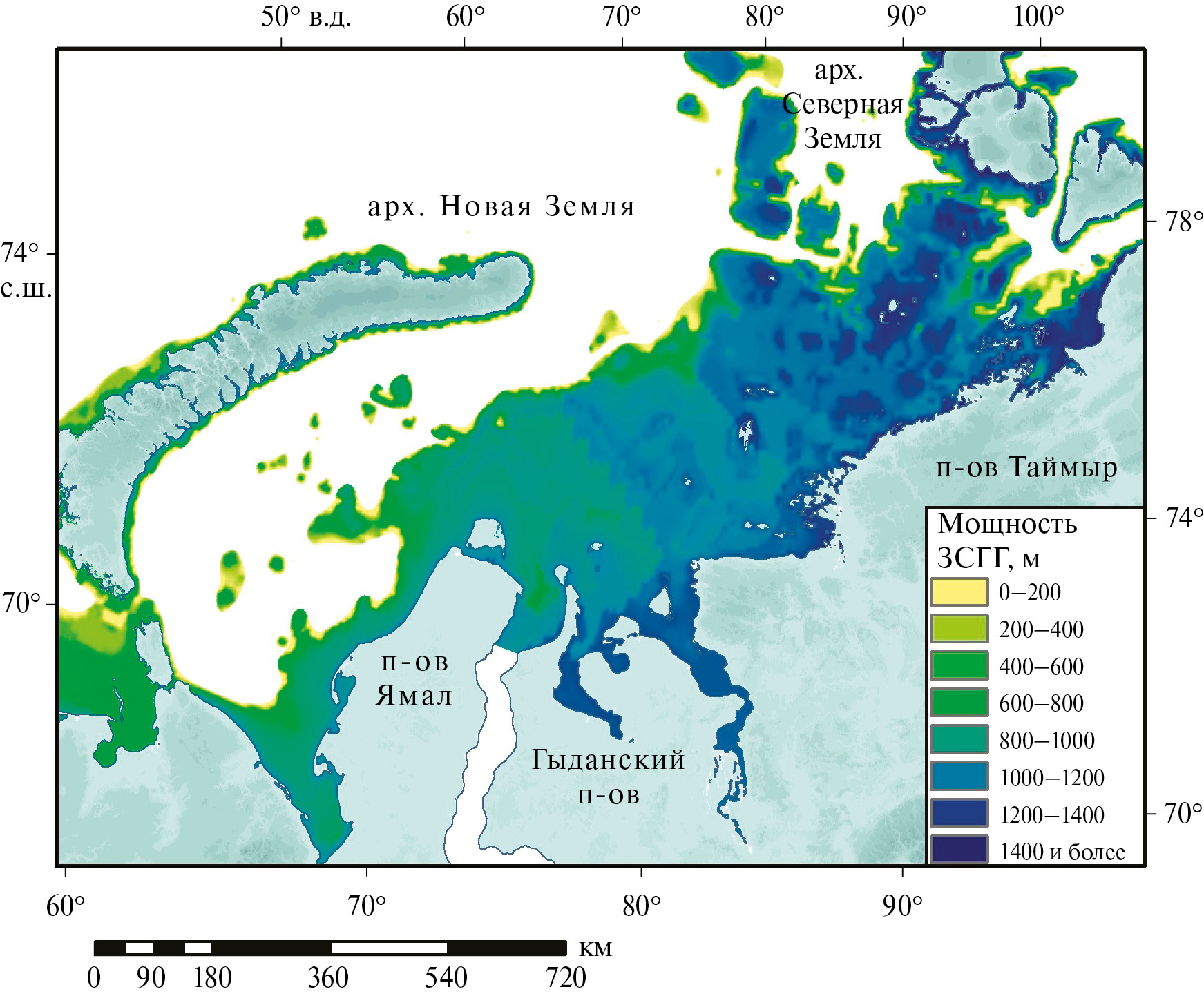 - Зона стабильности газовых гидратов, ассоциируемая с подводной мерзлотой, коррелирует с ними по характеру распространения. Поэтому наиболее благоприятные условия для гидратообразования прогнозируются в Северо-Карском бассейне, включая Притаймырский шельф, с его высоким газогенерационным потенциалом и мощными мерзлыми толщами, достигающими по модели толщины более 600 м и обуславливающими мощность модельной зоны стабильности газовых гидратов ~1400 м.