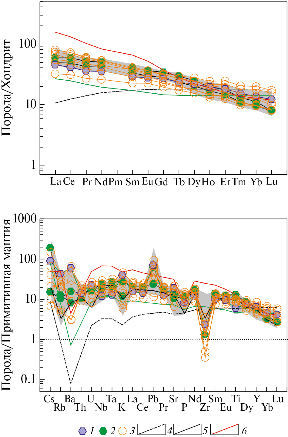 Дифференцированный спектр распределения РЗЭ на фоне обеднения тяжелыми РЗЭ ((Gd/Yb) =1.9–2.9) позволяет предполагать образование расплавов при плавлении гранатсодержащего обогащенного источника мантийного источника. Наше предположение подтверждают значения ΔNb ((1.74 + log(Nb/Y) – 1.92 log(Zr/Y)) в базальтах (1.3–1.8) и амфиболитах (1.2–2.4) [23].