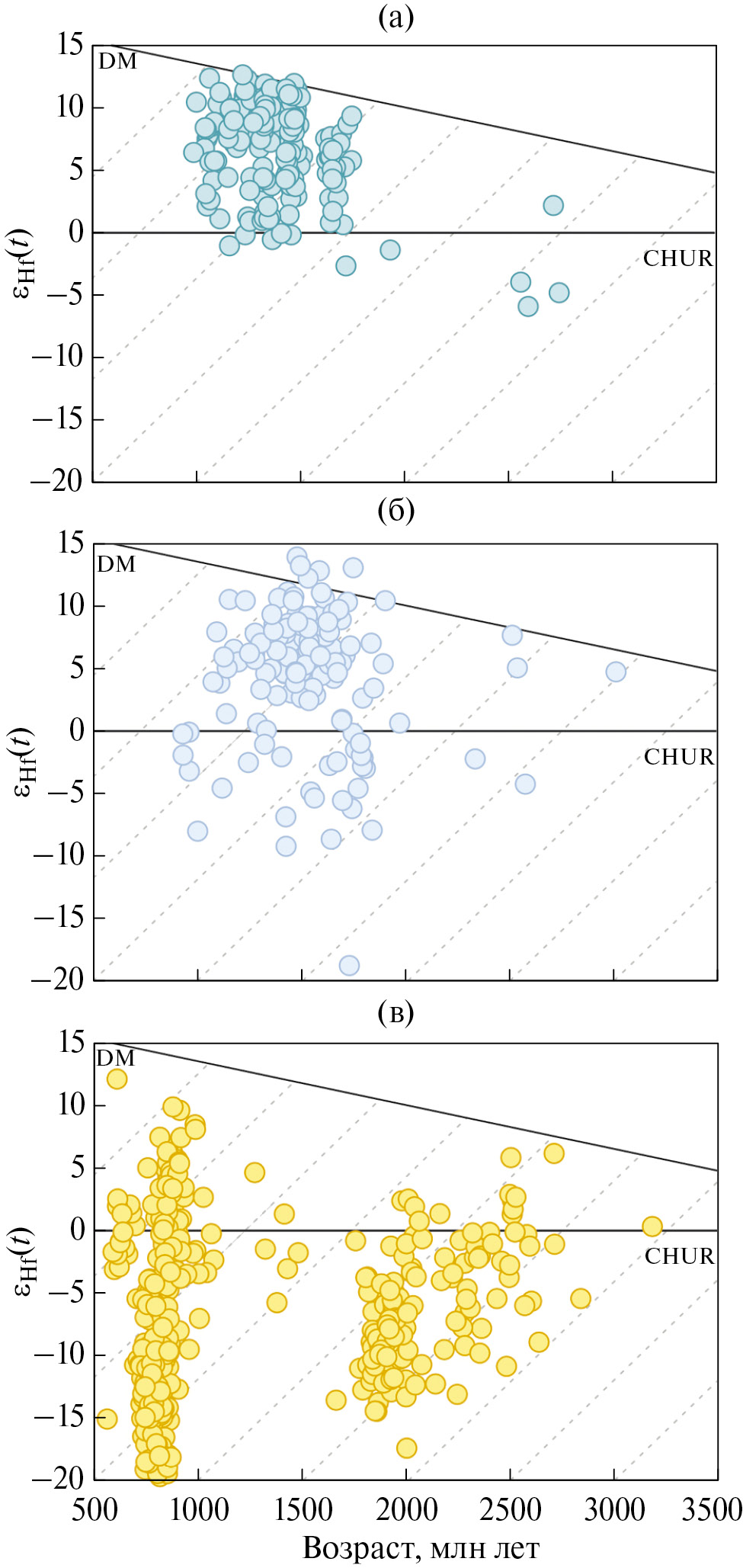 Изучение Lu–Hf изотопных характеристик цирконов выполнено в Центре коллективного пользования “Геоаналитик” УрО РАН (г. Екатеринбург, Россия) на ICP-масс-спектрометре Neptune Plus с приставкой для лазерной абляции проб NWR-213 по методике [28].