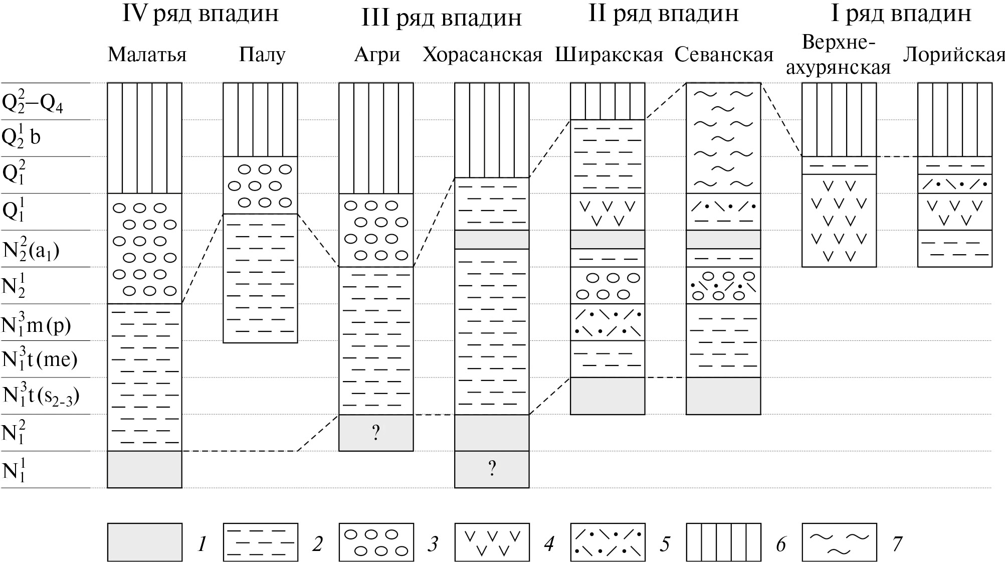 Рис. 3. Сводные разрезы неоген‒четвертичных отложений новейших впадин Севанской, Ширакской, Хорасанской, Маалатья и Палу.