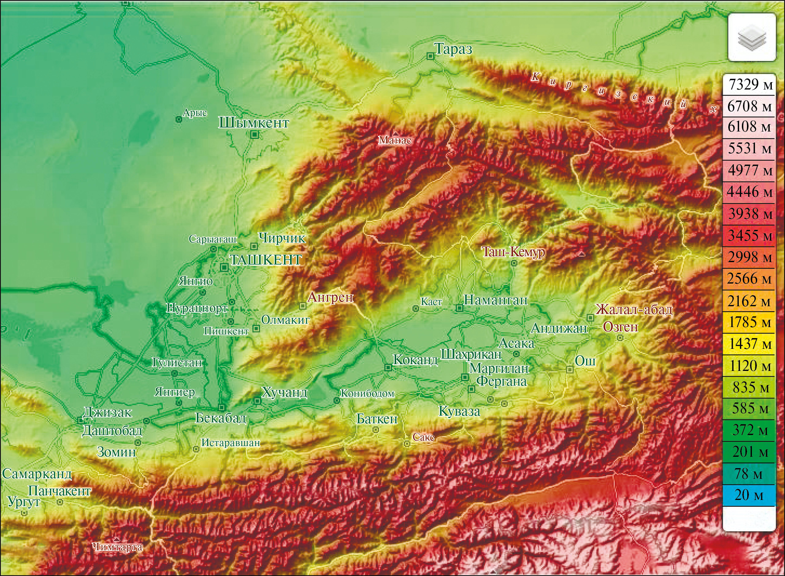 Рис. 1. Топографическая карта Ферганской впадины и ее окружения (по данным [22]).