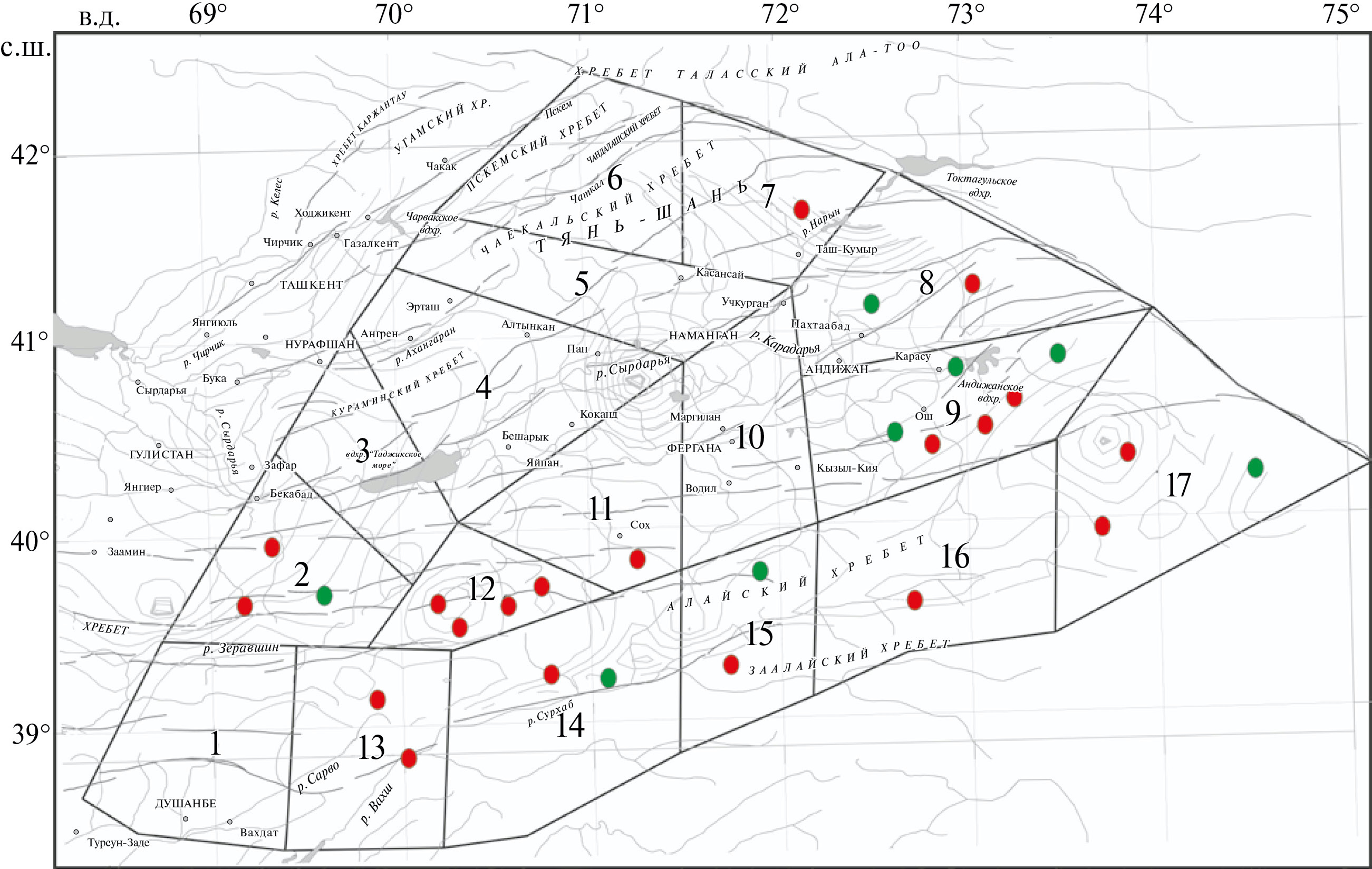 Рис. 2. Территория Ферганской впадины, разделенная на 17 зон, с указанием активных разломов. Показаны сейсмические события: реальные (кружочки красным); точно предсказанные с помощью алгоритма LSTM (кружочки зеленым).