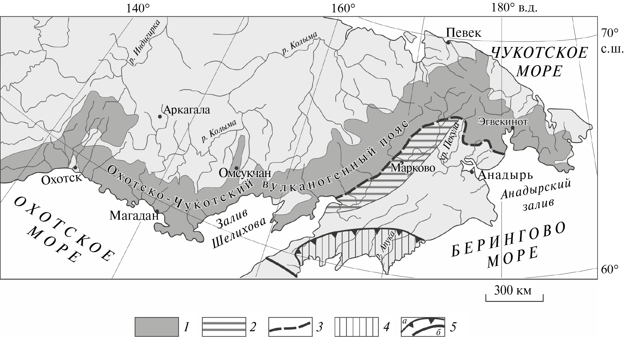 Таким образом, в современной структуре Евразийской окраины совмещены одновозрастные верхнемеловые вулканогенные образования [91] и, если Немуро-Олюторская внутриокеаническая дуга возникла в процессе субдукции океанической коры Пацифики, то формирование Охотско-Чукотского вулканогенного пояса, отделенного этой дугой от Пацифики, должно быть связано с существованием иного океанического бассейна, существовавшего на протяжении ~20 млн лет [60].