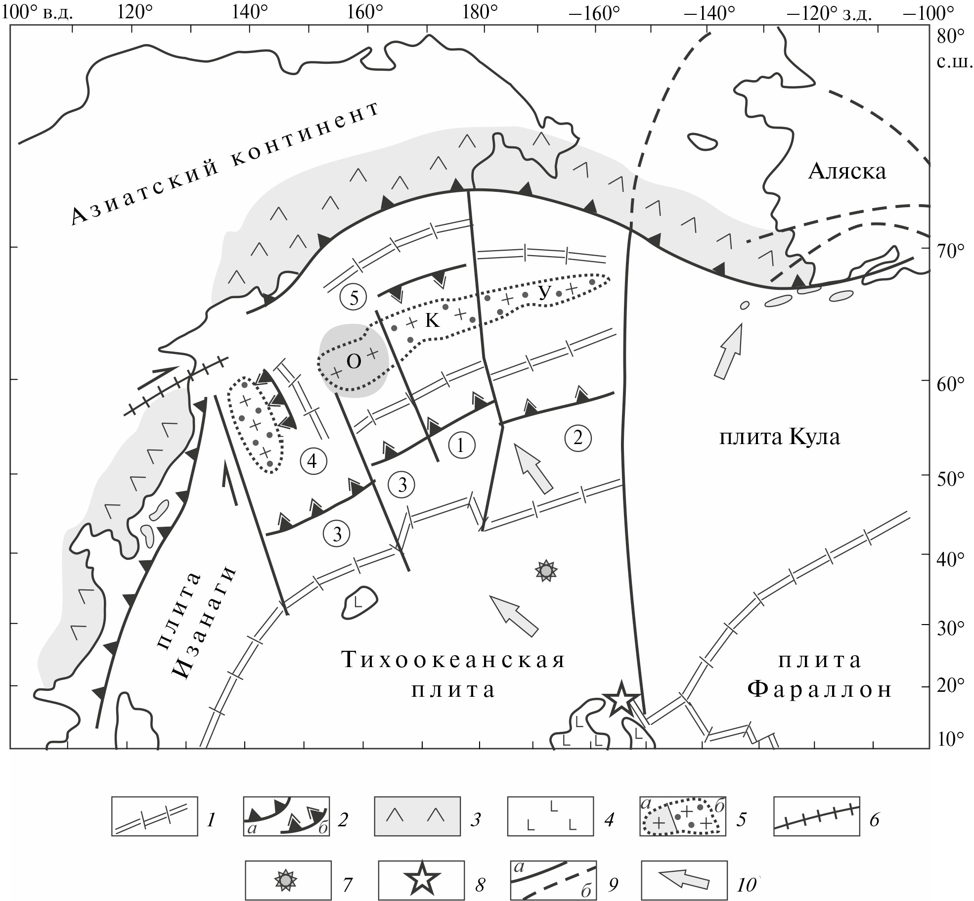 1 – Евразийский континент; 2 – Удско-Мургальская позднеюрская–раннемеловая вулканическая дуга; 3 ‒ Охотско-Чукотский окраинно континентальный вулканический пояс; 4 – направление перемещения океанической плиты Изанаги в позднем мелу