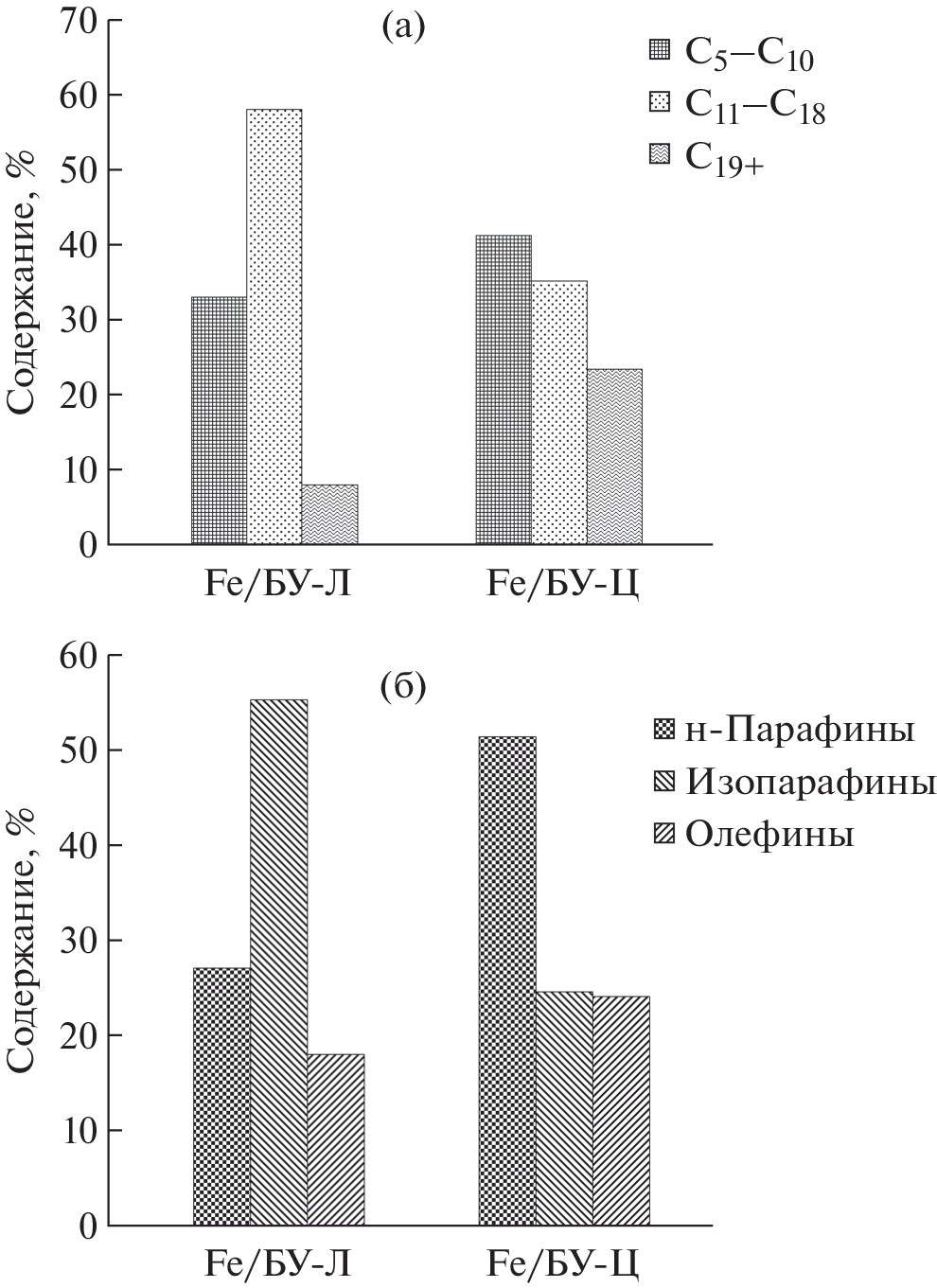 Исследованы нанесенные железные катализаторы на основе углеродосодержащего материала, представляющего собой биоуголь, полученный методом гидротермальной карбонизации биополимеров (целлюлозы и лигнина). Каталитические системы показали высокую активность в синтезе Фишера–Тропша. Зафиксирован не характерный для железосодержащих катализаторов состав жидких продуктов С5+, отличающийся высоким содержанием изоалканов (до 55%). Данный факт продискутирован в ключе теории о бифункциональных центрах, предложенной А.Л. Лапидусом с сотрудниками. Высказано предположение, что активные центры исследованных катализаторов могут рассматриваться как бифункциональные (карбидная фаза, оксидная фаза). Показана корреляция данных синтеза Фишера–Тропша на исследованных катализаторах с данными, полученными А.Л. Лапидусом с сотрудниками на кобальтсодержащих катализаторах.