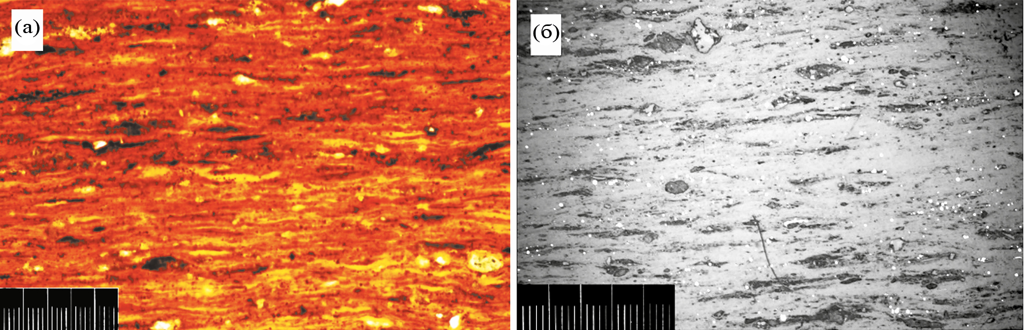 Рис. 1. Петрографический состав горючего сланца Кашпирского месторождения с повышенным содержанием органического вещества. Обр. 117-К-III. а – в проходящем свете (шлиф), б – в отраженном (аншлиф). Разные участки. Цена деления линейки 0.01 мм.