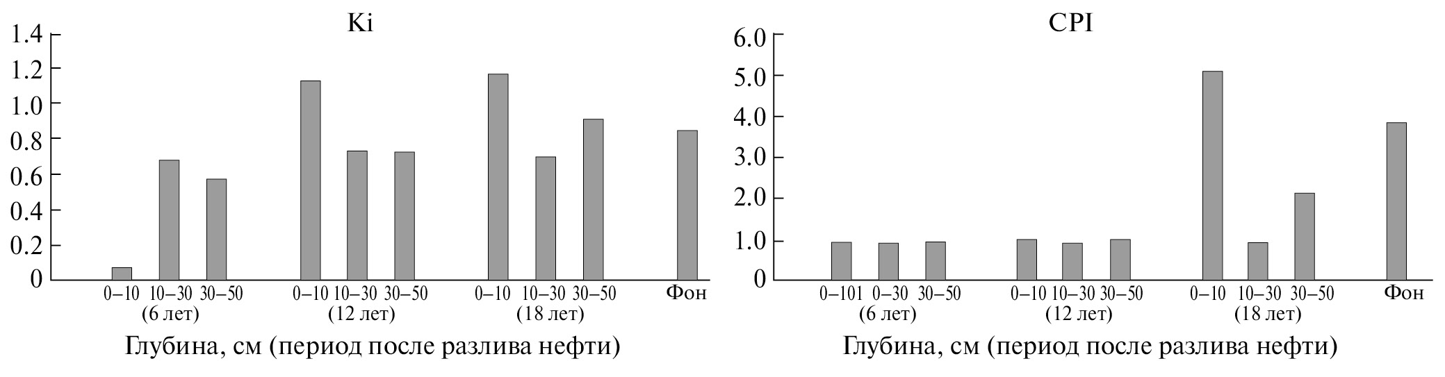 Коэффициент нечетности (CPI – carbon preferences index) – отношение нечетных к четным н-алканам – отображает вклад в состав органического вещества осадков УВ нефти [16]. Для наших образцов этот индекс изменяется от 0.9 до 5.06. В большинстве изученных образцов индекс CPI приближен к единице, что отражает их существенное загрязнение нефтью (рис. 3). И только образцы почв с наиболее старым (18 лет) загрязнением, особенно с поверхности, и фоновый образец показали отсутствие в них, или весьма незначительный вклад, нефтяных н-алканов.