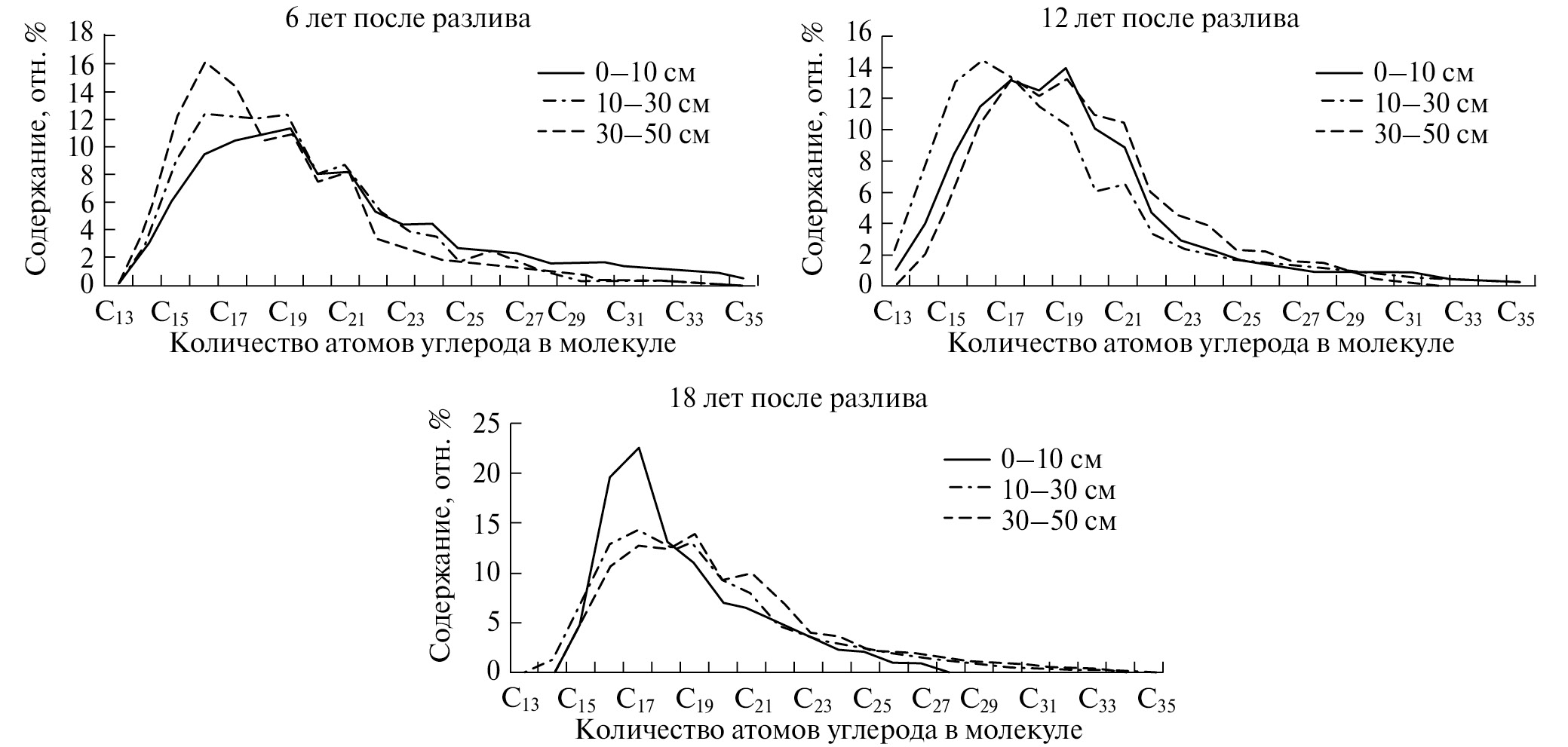 В образцах почв с наиболее старым загрязнением (18 лет, разлив в 2003 г.) максимальное содержание низкомолекулярных нефтяных алканов приходится на слой 10–30 см, а минимальное – на поверхностный (0–10 см), где основная часть представлена биологическими С21–С29 гомологами. Видимо, в результате длительного действия солнечного света и бактерий на поверхностный слой произошло разрушение основной массы нефтяных н-алканов. На глубине более 30 см присутствует сопоставимое количество нефтяных и биологических н-алканов. Пониженное суммарное содержание в этом слое н-алканов, как и других нефтяных соединений, может быть следствием сорбционных эффектов при просачивании нефти вниз по почвенному разрезу, а также вторичной миграции в верхние слои. О последнем свидетельствует повышенное содержание в этом слое более хроматографически полярных ароматических УВ. Отличительной особенностью этого слоя является также смещение максимума ММР н-алканов на С19, в отличие от вышележащих слоев, в которых преобладает С17. Во всех образцах почв на участках, загрязненных в 2009 (12 лет) и 2015 (6 лет) годах в составе н-алканов, наблюдается подавляющее доминирование соединений нефтяного генезиса. Но в почве с более свежим загрязнением (6 лет) на глубине 10–30 и 30–50 см в составе н-алканов преобладает С16, а на участке с 12-летним загрязнением в нижней части исследованного разреза (30–50 см), как и в случае 18-летнего, максимум сдвинут на С19.