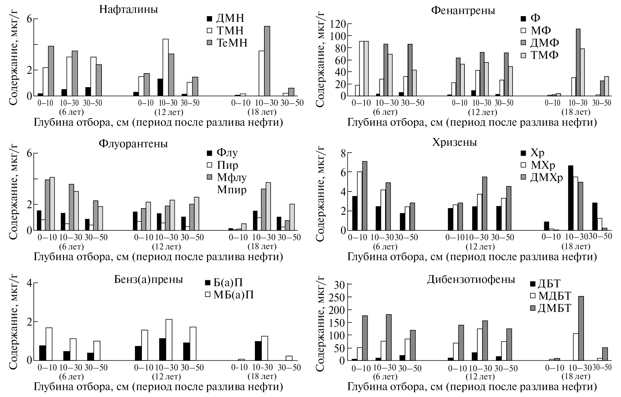 В разрезе торфяной почвы (0–50 см) через 6 лет после попадания на нее нефти максимальное количество нефтяных соединений содержится в верхних 30 см. С увеличением времени после загрязнения нефтяные компоненты концентрируются в слое 10–30 см. В нижних 30–50 см на фоне снижения общей концентрации нефтяных соединений, в их составе увеличивается доля ароматических структур, преимущественно полиметилзамещенных.