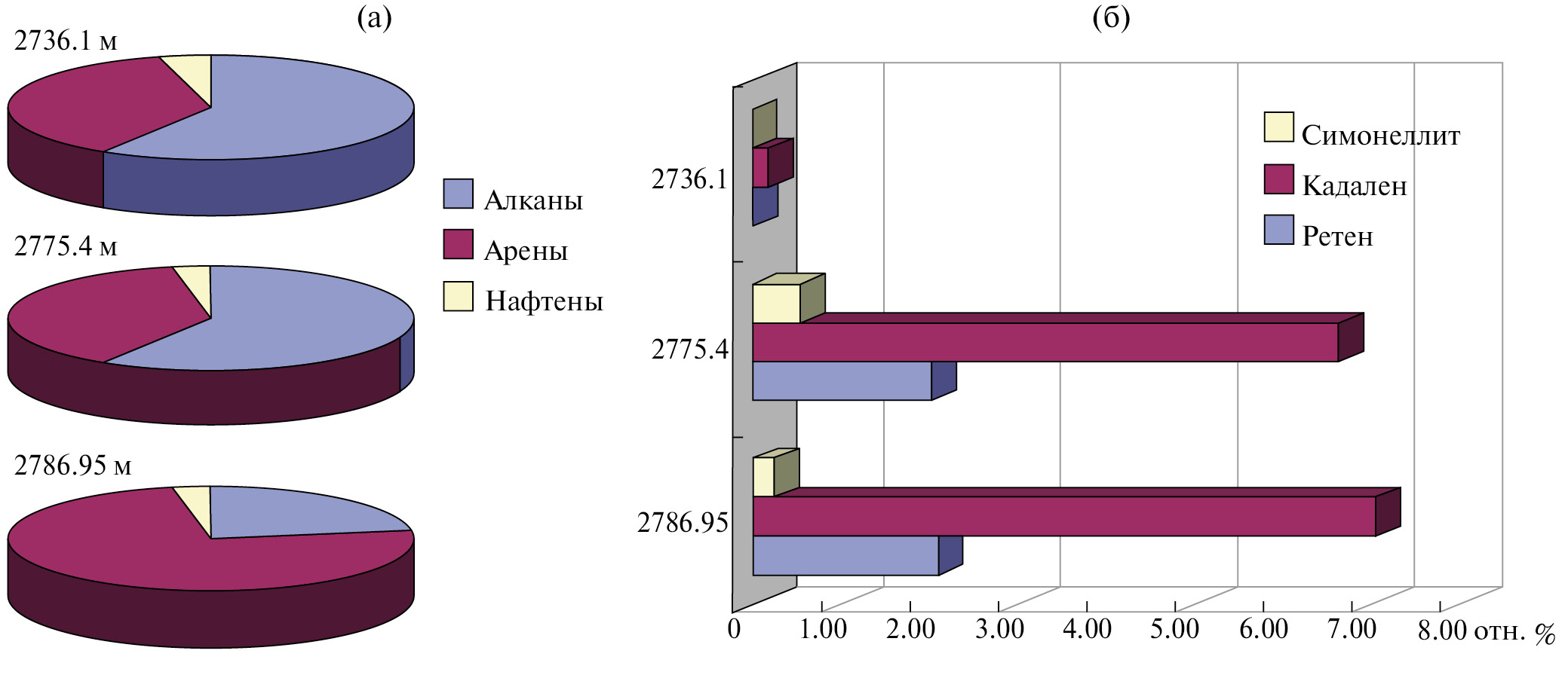 ОВ марьяновской свиты характеризуется преобладанием в смеси УВ алканов – ациклических насыщенных структур (2736.1 м), в ОВ наунакской свиты доминируют ароматические УВ (рис. 1, а). Среди ароматических УВ во всех верхнеюрских осадках преобладают нафталины. Их относительное содержание несколько снижается вниз по разрезу. Возрастает доля фенантренов, содержание кадалена и ретена (рис. 1, б). Максимальное содержание симонеллита зафиксировано в породах верхней части наунакской свиты. Алканы в марьяновской и верхней части наунакской свит представлены преимущественно С14–С16 гомологами, в нижней части наунакской свиты молекулярно-массовое распределение н-алканов бимодально с основным максимумом, приходящемся на С14, и дополнительным – на С25 и С27.
