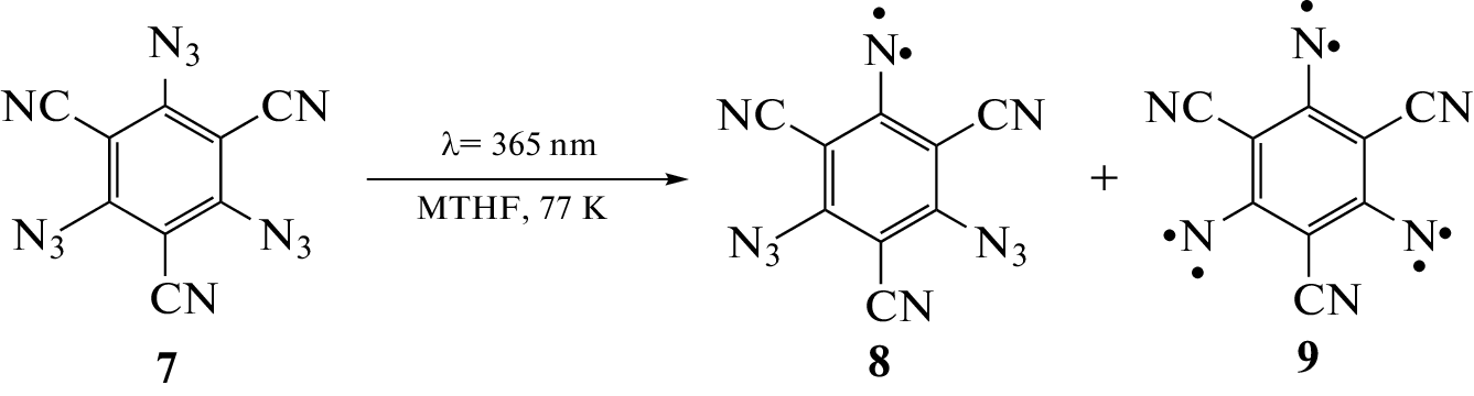 High-spin products of photolysis of 1,3,5-triazido-2,4,6-trichlorobenzene in a 2-methyltetrahydrofuran solution frozen at 6 K has been studied using EPR spectroscopy in combination with quantumchemical calculations. It has been found that the photolysis of this triazide leads to the formation of a mixture of triplet 1,3-diazido-2,4,6-trichlorophenyl-5-nitrene, quintet 1-azido-2,4,6-trichlorophenyl-3,5-dinitrene, and septet 2,4,6-trichlorophenyl-1,3,5-trinitrene. The solvent effect on the EPR spectra and the magnetic