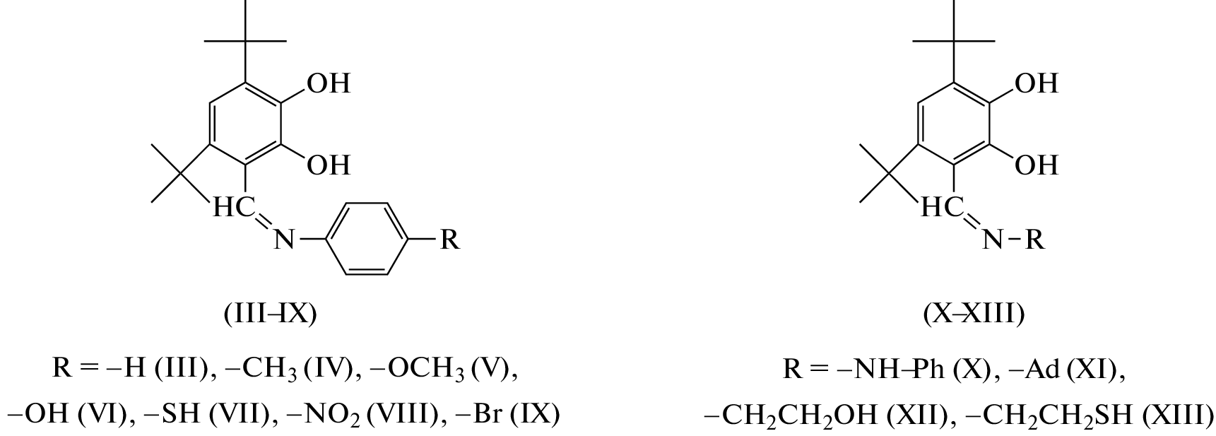 The effects of azomethine derivatives of 4,6-di-tert-butyl-2,3-dihydroxybenzaldehyde on the formation of radiolysis products of deaerated n-hexane and ethanol have been studied. It was shown that the catechol moiety in the tested compounds did not significantly affect their reactions with carbon-centered radicals. The aldimine group exhibited high activity as an α-hydroxyalkyl radical scavenger and low activity as a scavenger of alkyl radicals. The introduction of additional radical-inhibiting groups –OH, –SH, –NO2, and =N–NH– into the side fragment of a molecule led to a significant increase in the antiradical activity with