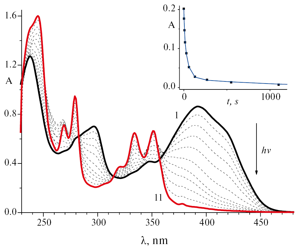 На рис. 2 показаны спектральные изменения при фотолизе диады DoX светом с длиной волны 442 нм, на вставке дана кинетика изменения поглощения на длине волны облучения. Эти спектральные изменения аналогичны наблюдавшимся ранее для диады D10 [17] и свидетельствуют о протекании двух реакций – фотоизомеризации (схема 2) и ФЦП с образованием соответствующего циклобутана CBoX (схема 3). ДВПП циклобутана представляет собой систему колебательно-разрешенных полос поглощения с максимумами 321, 334 и 351 нм (рис. 2, спектр 11), характерных для несопряженного пиренового ядра. Поскольку циклобутан CBoX не поглощает свет с длиной волны 442 нм, при облучении диады этим светом не происходила обратная реакция ретро-ФЦП. В то же время свет 442 нм поглощают оба изомера PEQ-фотохрома, и вследствие обратимости реакции, в конце концов, все изомеры диады (через EE изомер) подвергались реакции ФЦП и наблюдалась полная конверсия диады в циклобутан CBoX.