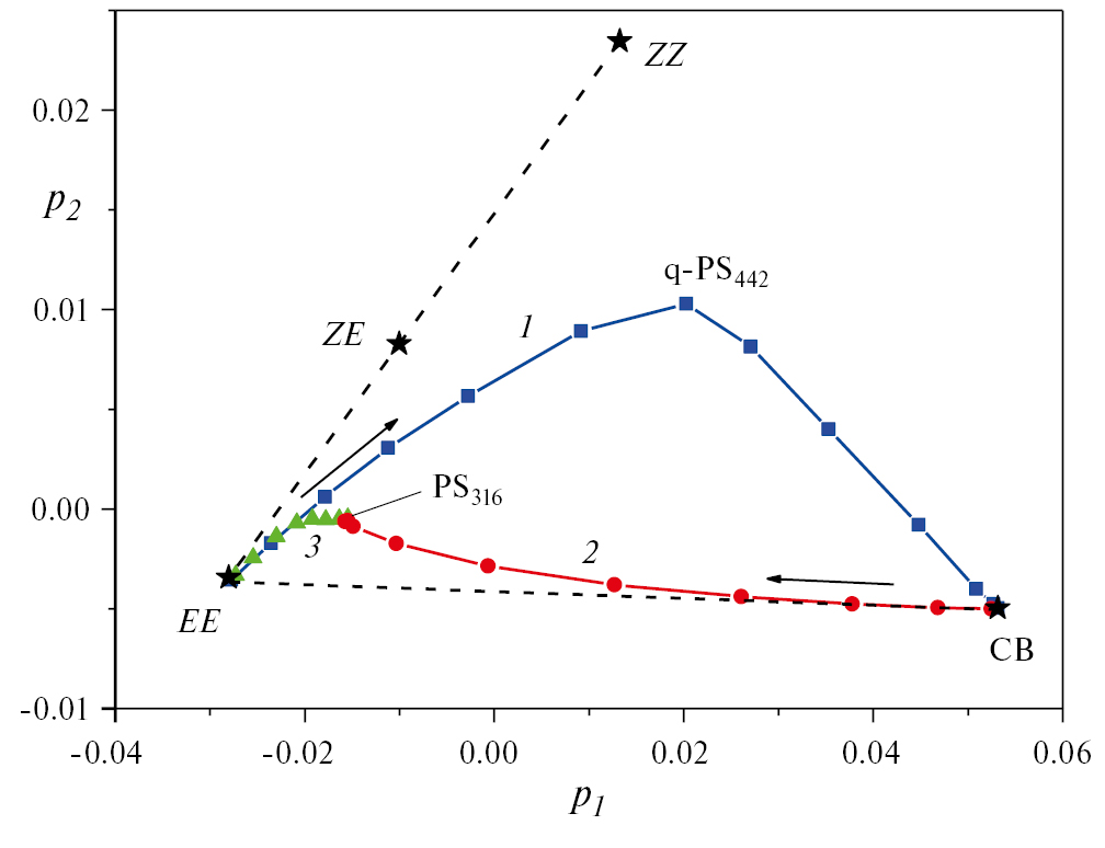 Рис. 4. График счетов – обработка методом главных компонент (principal component analysis) спектральных изменений, происходящих при фотолизе диады светом с длиной волны 442 нм (1) и 316 нм (3) и циклобутана светом с длиной волны 316 нм (2); спектры представлены в общем базисе двух первых сингулярных векторов p1 и p2. Отмечены точки, соответствующие экспериментальным спектрам EE изомера диады DoX, циклобутана CBoX (CB), ФС PS316 и квази-ФС q-PS442, а также модельным спектрам ZE и ZZ изомеров диады (см. текст), стрелки показывают направление спектральных изменений при фотолизе.