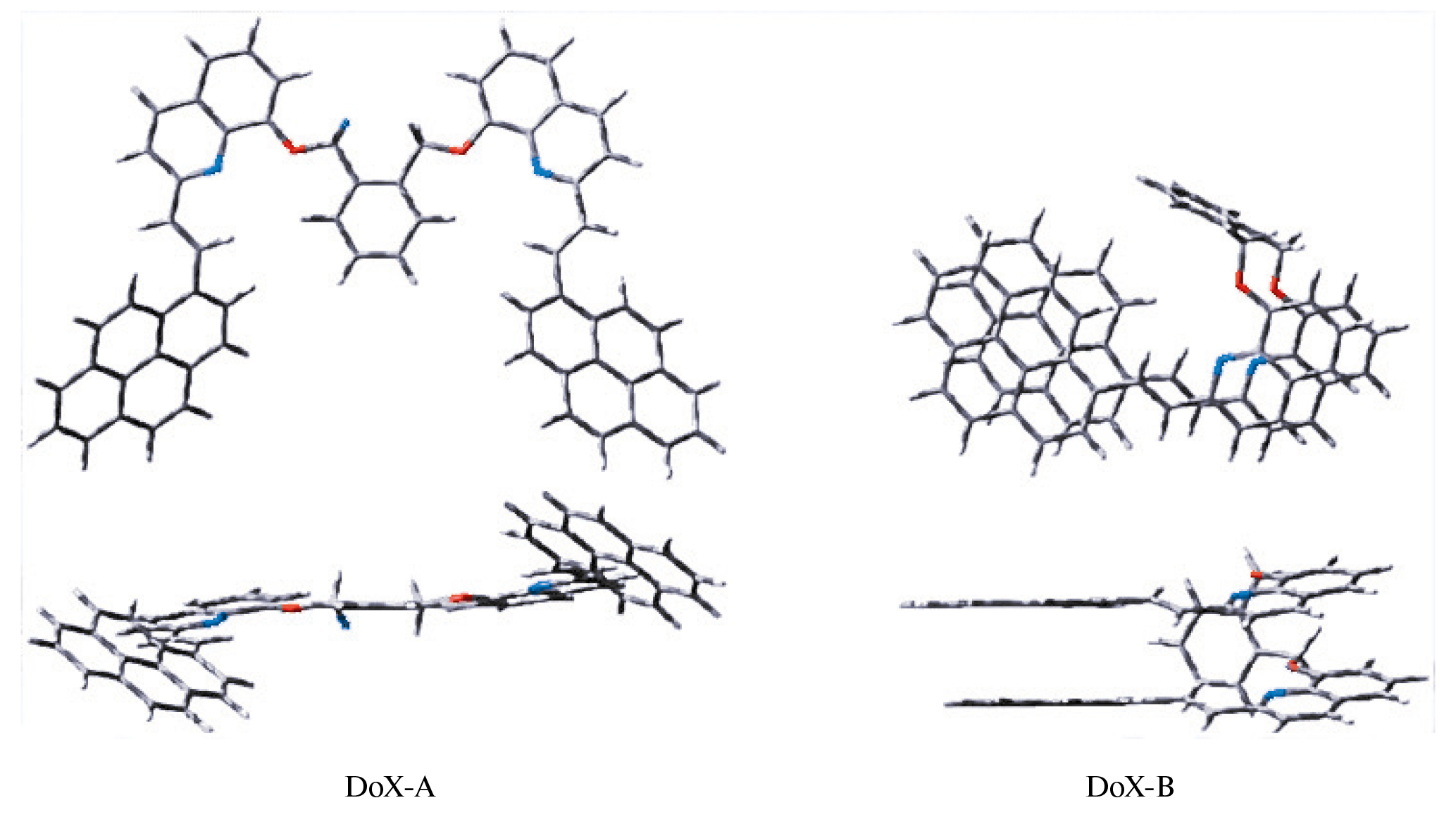 Характерной особенностью PEQ-фотохрома является неплоское строение: пиреновое ядро вывернуто из плоскости фотохрома на 31.9°, вследствие стерического взаимодействия с атомами водорода этиленовой группы [16]. Эта особенность сохраняется в конформерах диады DoX, рис. 6.