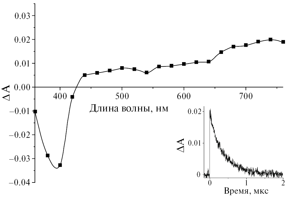 Рис. 3. Дифференциальный спектр поглощения соединения DBD (С = 3.0 × 10-5 М) в ацетонитриле в присутствии кислорода, 100 нс после вспышки (lвозб = 355 нм). Вставка: кинетика гибели триплетного состояния при 700 нм (kT = 2.5 × 106 c-1).