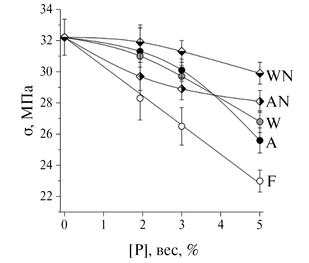 Рис. 1. Прочность на сжатие s для ЦППК в зависимости от содержания [P] и режима обработки порошка ПЭВП. Схожие зависимости наблюдаются в случае порошков ПП, ПС и ПЭТФ.