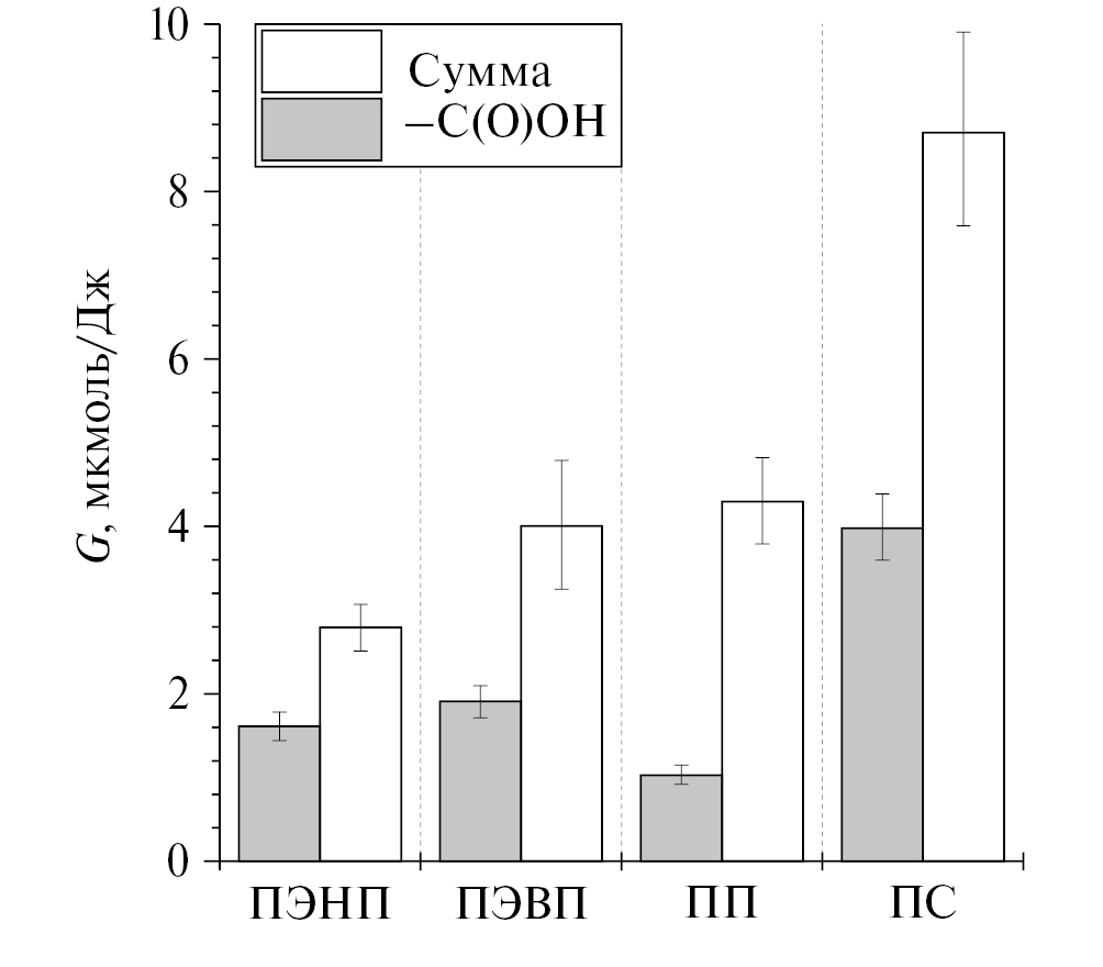 На поверхности более вероятен мономолекулярный распад ROO · по реакциям (1) и (2). Бимолекулярная реакция (3) с участием соседних макромолекул RH (источник Н) предпочтительна в объеме пластика. Реакции (1)–(3) обеспечивают цепное развитие окисления. Карбоксильные группы на поверхности образуются с заметными выходами [8]. В частности, преобразование карбонила в карбоксил характерно для алифатических кетонов. При окислении ароматических углеводородов выход кислот превышает 0.1 мкмоль/Дж. Выход карбоксильных групп при объемном радиолитическом окислении линейного полиэтилена и сополимера этилена с пропиленом составляет 0.7 и 0.5 мкмоль/Дж соответственно [8]. Карбоксильная группа может также входить в состав малой карбоновой кислоты, отщепляемой при радиолизе.