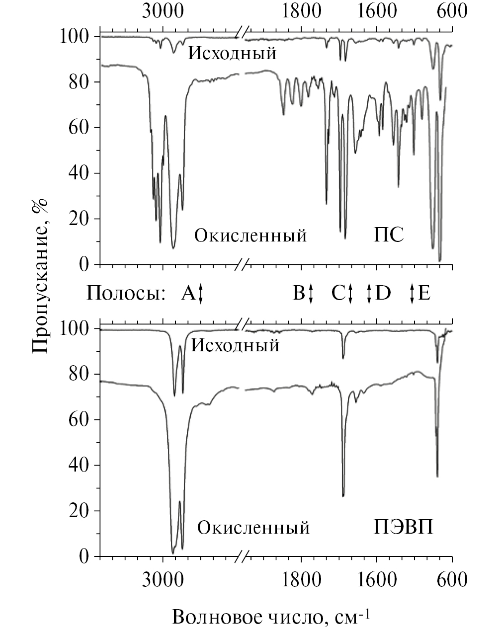 Изменение степени окисления поверхности пластиков регистрировалось с помощью ИК-Фурье спектрометра ФТ-801 (ООО НПФ “Симекс”, Россия) с двумя приставками. В случае пластиковых порошков использовалась приставка (микроскоп) Микран 3 с зеркальным отражением от стальной подложки в диапазоне 4000–650 см-1 с разрешением 4 см-1. В случае пластиковых пленок применялась приставка НПВО (алмаз) в диапазоне 4000–600 см-1 с разрешением 4 см-1.