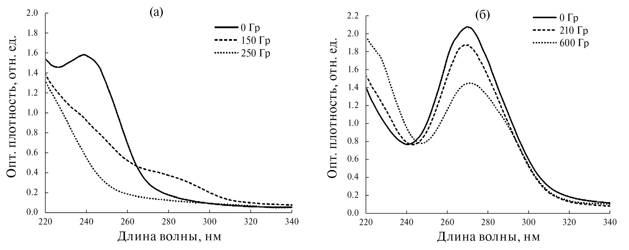 Рис. 1. Спектры оптического поглощения растворов МДА (pH 3; С = 7 × 10-5 М) (а) и (pH 11; С = 8 × 10-6 М) (б) при различных величинах поглощенных доз.