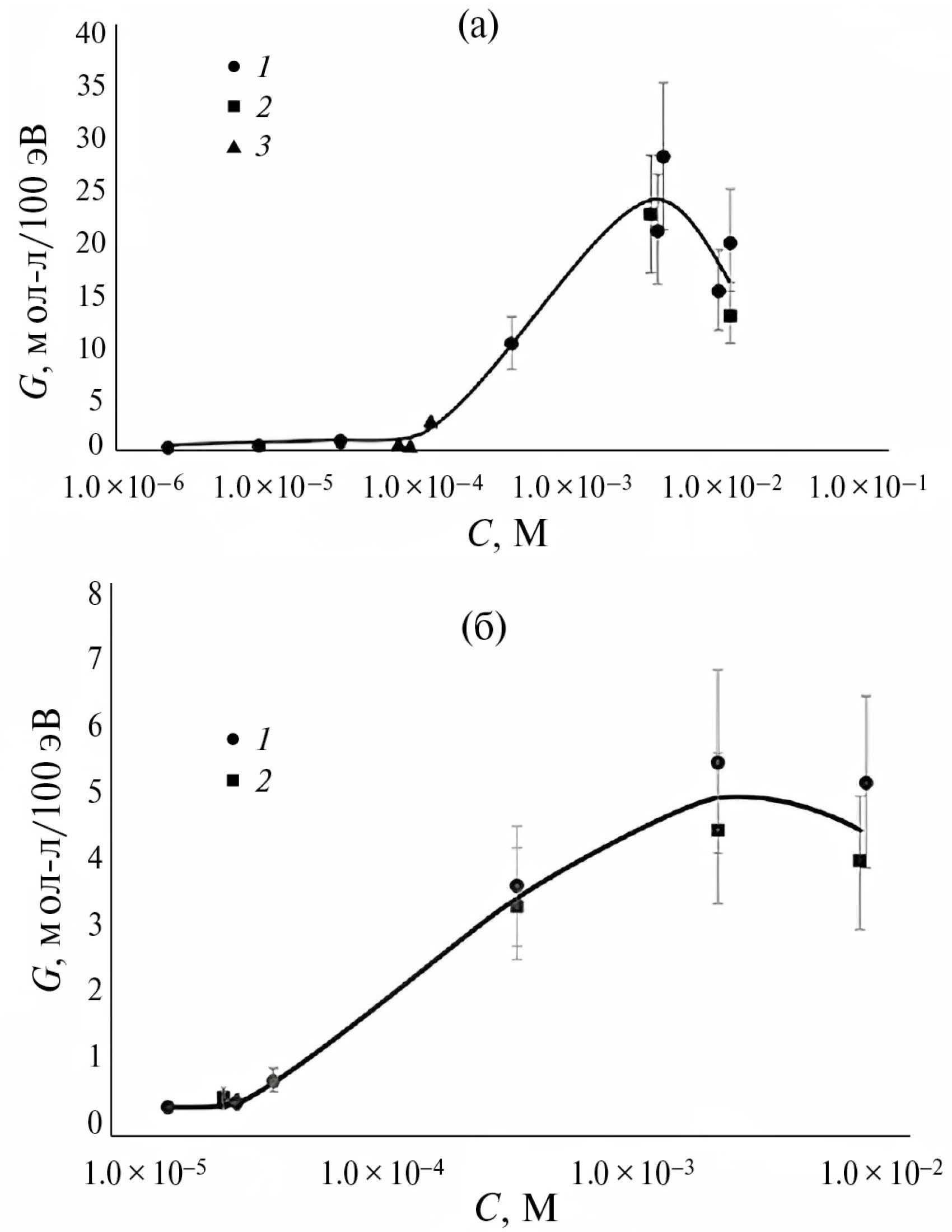 Полученные результаты однозначно указывают на наличие влияния исходной концентрации МДА на эффективность его радиолиза, причем зависимость РХВ разрушения МДА от его концентрации оказалась экстремальной, достигая максимальных значений при концентрации около Со = 8 × 10–3 М. При указанной концентрации МДА значения выхода разрушения в кислой среде достигают величин около 30 молекул/100 эВ, что свидетельствует о протекании в системе цепных реакций, возможный механизм которых предложен выше.