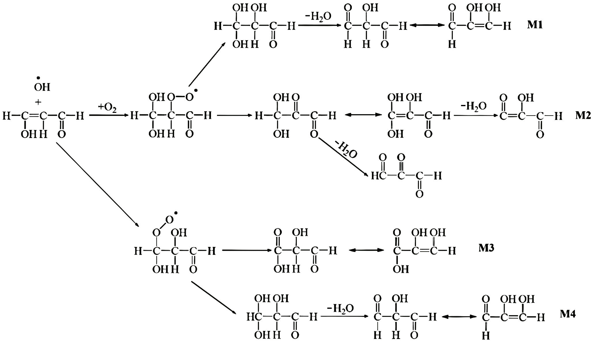 Взаимодействие этих молекул с гидроксильным радикалом приводит к образованию углеродцентрированного радикала с двумя гидроксильными группами. Именно эти радикалы могут быть источником молекул уксусной кислоты после протекания реакции дегидратации с миграцией валентности (реакции (7), (8))
