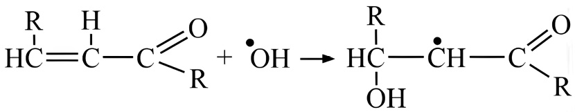 Радиолиз непредельных карбонильных соединений может протекать по двум различным механизмам [3]: либо путем взаимодействия сольватированного электрона с карбонильной группой (реакция (1)), либо по реакции присоединения радикалов •Н и •ОН (реакции (2), (3)) к двойной углерод-углеродной связи.