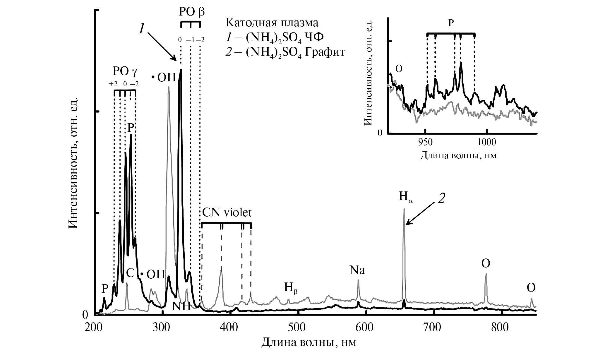 На рис. 2 представлены два обзорных спектра свечения катодной плазмы с графитовыми и фосфорными электродами в водном растворе электролита 1 М (NH4)2SO4, полученные с одинаковым временем выдержки 200 мс. При расшифровке спектров использовались справочные данные из [11–14].