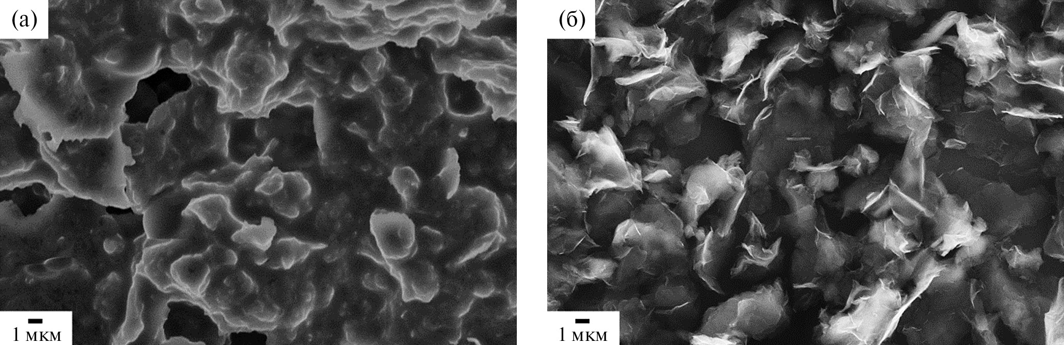 Относительно низкое разрешение полученных экспериментальных спектров усложняет диагностику плазмы. Кроме этого, близость к УФ-границе рабочего диапазона спектрометра наиболее чувствительной линии атома P (213 нм) и затенение второй атомной линии P (253 нм) PO γ-bands (Δv = –1) вносят заметные искажения в соотношение интенсивностей, которое используется для расчета температуры [13]. Ввиду этого оценка температуры производилась для обоих электродов по отношению интенсивностей двух спектральных линий Hα и Hβ, принадлежащих одному и тому же атому. При этом предполагается, что используемая в данной работе экспериментальная конфигурация обеспечивает выполнение необходимых для этого метода условий: оптически тонкая плазма в локальном термодинамическом равновесии без самопоглощения [13]. Интенсивности линий были скорректированы с учетом спектральной чувствительности прибора. Значения используемых в расчетах величин для излучательных переходов взяты из онлайн-базы NIST [11]. Для фосфорного электрода температура составила ~4020 ± 600 К, а для графитового – ~3580 ± 500 К, что близко к результатам для высокочастотного разряда в работе [16], несмотря на небольшую точность нахождения температуры всего по двум неинтенсивным линиям. Метод относительных интенсивностей позволяет определить температуру возбуждения, а следовательно, и электронную температуру, которую принимают за температуру газа плазмы. Важно отметить, что эти оценки температуры электролизной плазмы достаточно близки для обоих электродов. Как было сказано выше, в представленной работе синтез МГС и МФС проводился в максимально близких экспериментальных условиях – величины налагаемых на электроды импульсов напряжения, состав электролита, геометрические параметры электрохимической ячейки и системы наблюдения были полностью идентичны. По этой причине можно предположить, что существенно более низкая интенсивность линий OH-радикалов, атомов кислорода и водорода, наблюдаемых в электролизной плазме при расщеплении ЧФ по сравнению c графитом при близких значениях температуры, обусловлена в первую очередь значительно большей скоростью взаимодействия этих интермедиатов с МФС, чем с МГС. Такой вывод не представляется удивительным, так как общепринято, что наличие неподеленной пары электронов на поверхности фосфореновых структур приводит к их высокой реакционной способности, в отличие от графеноподобных частиц, базальная плоскость которых характеризуется относительно высокой химической стабильностью [4, 17]. Определенным доводом в пользу этого предположения служат результаты EDX-анализа содержания кислорода в синтезированных фосфореновых и графеновых структурах (23.9 и 2.7 ат. % соответственно), СЭМ-изображения которых приведены на рис. 3.