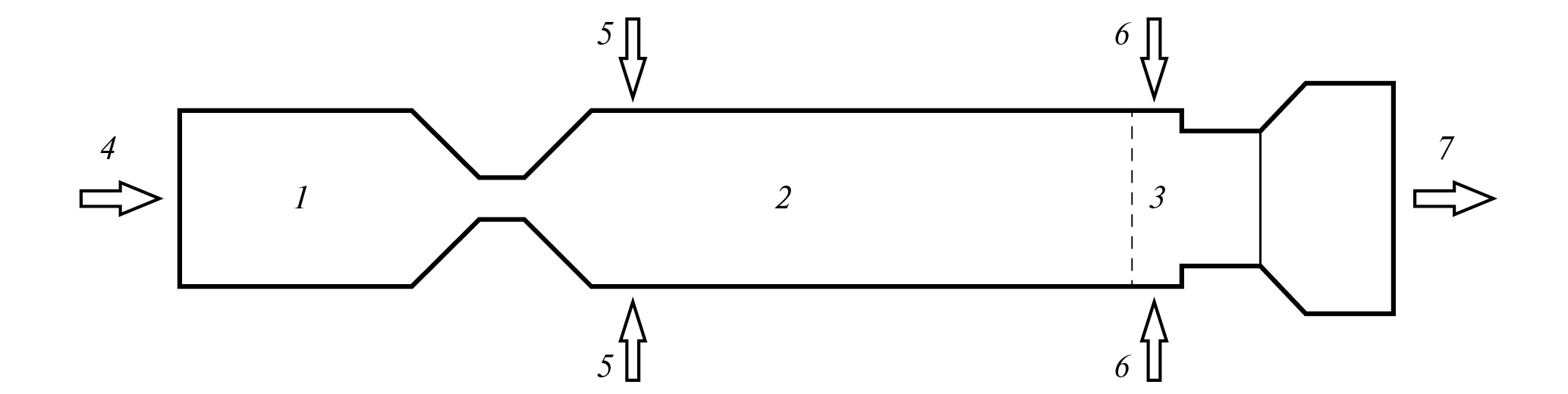 Рис. 1. Схема плазмохимического реактора. 1 – плазмотрон, 2 – реактор, 3 – зона закалки, 4 – подача водорода или метана (природного газа), 5 – подача дополнительного потока метана (природного газа), 6 – закалка водой, 7 – поток продуктов реакции в узел разделения