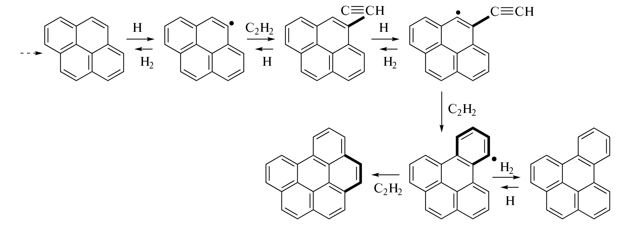 На рис. 2 показан этот переход от пирена к 1,12-бензоперилену. Этот переход описывается брутто-реакцией: Ai + 3C2H2 → Ai+2 + 2H2. Здесь i − число бензольных колец в молекуле. Константы реакций взяты из работы [30].