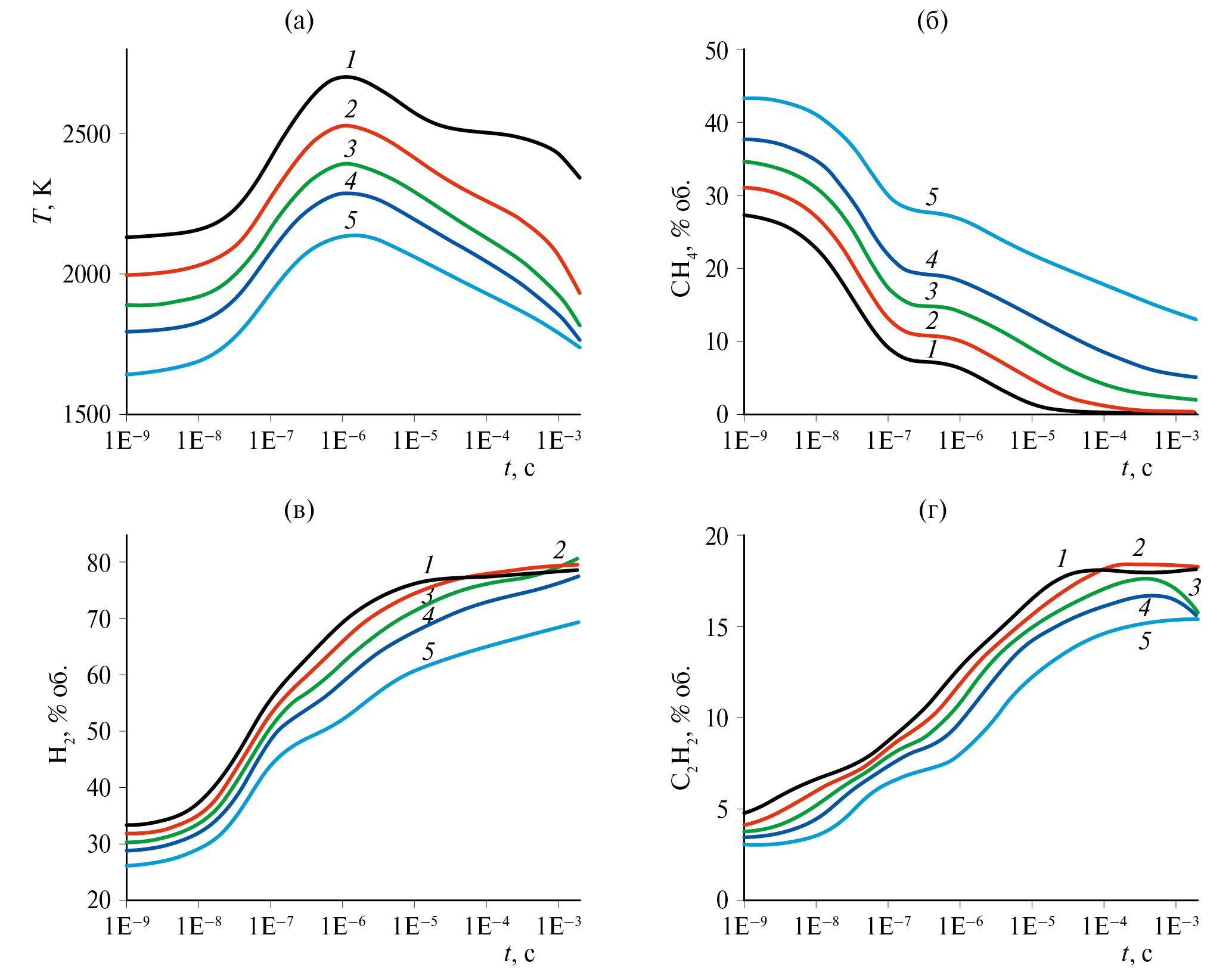 Наибольший выход водорода и ацетилена наблюдается при отношении потоков F2/F1 = 1.2 на временах около 10-3 с. Здесь F1 и F2 – объемные потоки высокоэнтальпийного газа из плазмотрона и “холодного” метана соответственно [л/мин]. Проведенный нами кинетический анализ показал, что на малых временах (≈10-7 c) основными процессами, приводящими к образованию ацетилена, являются реакции (20)–(21):