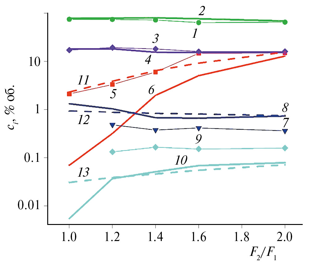 Результаты расчетов основных продуктов разложения метана (водорода и ацетилена) хорошо согласуются с экспериментальными данными для всех значений F2 /F1 (рис. 4). Концентрация метана хорошо совпадает для больших значений F2/F1 и плохо – для значений F2 /F1, равным примерно единице. Мы допускаем, что это различие может быть связано с нашим предположением о мгновенном смешении потока плазмы и холодного метана. Характерное время перемешивания двух потоков можно оценить по соотношению [46]: