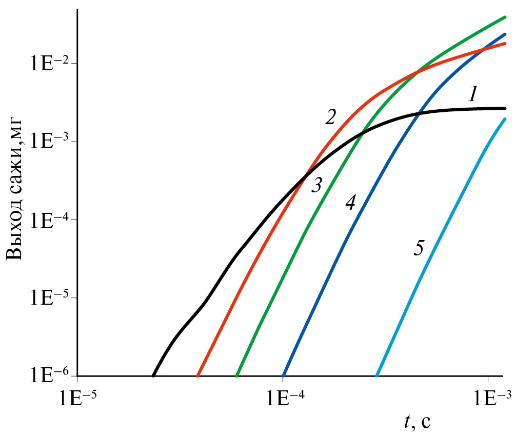 Рис. 5. Зависимость выхода сажи от времени пребывания газа в реакторе при разных значениях расхода холодного метана F2 для случая М1 = 50 л/мин, Т1 = 3500 К, Т2 = 300 К, р = 1 атм. F2/F1 = 1.0 (1), F2/F1 = 1.2 (2), F2/F1 = 1.4 (3), F2/F1 = 1.6 (4), F2/F1 = 2.0 (5)
