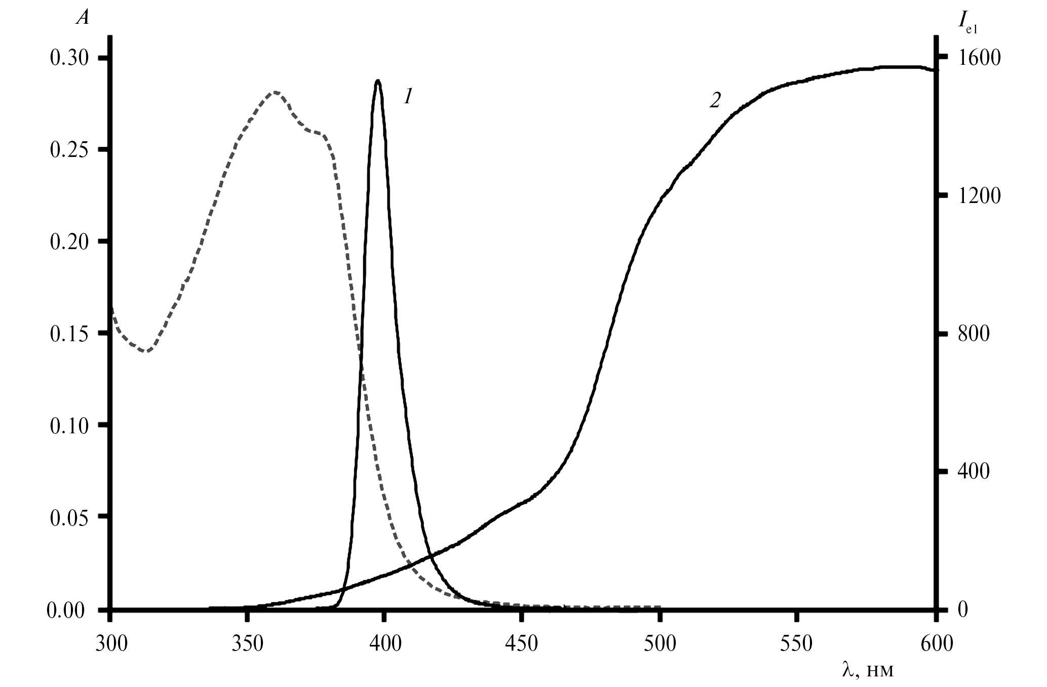 Рис. 1. Спектры испускания LED (λ = 395 нм) (1) и лампы КГМ-24-150 (2). Пунктиром показан спектр поглощения соединения 1 в растворе ДМСО.