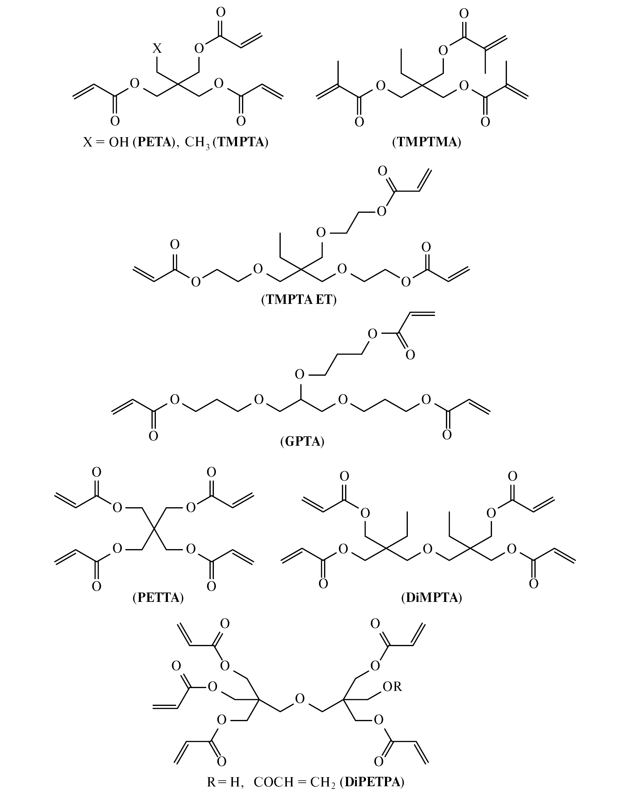 Соединение 1 было протестировано в качестве LED-фотоинициатора в полимеризации многофункциональных (мет)акрилатов различного строения, структуры которых представлены на схеме 1.