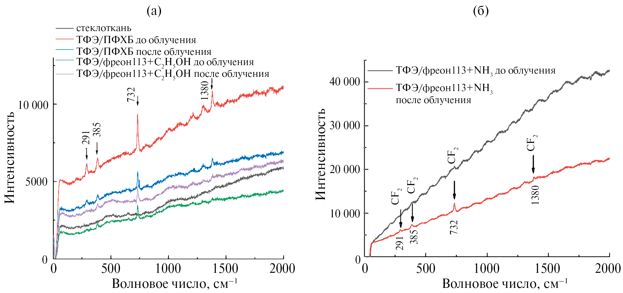 Облучение стеклоткани с теломерными покрытиями дозой 600 кГр на воздухе и в вакууме и последующий анализ спектров КР показали, что никаких существенных изменений в спектрах не наблюдается. Воздействие облучения приводит к уменьшению фона и частичному разрешению пиков C–F в спектре покрытия из раствора теломера ТФЭ/фреон113 + аммиак (рис. 2б). Это не удивительно, поскольку все основные изменения в ИК-спектрах наблюдались для полос, связанных с колебаниями концевых групп теломеров, которые, к сожалению, не удалось зарегистрировать в спектрах КР из-за их малой интенсивности.