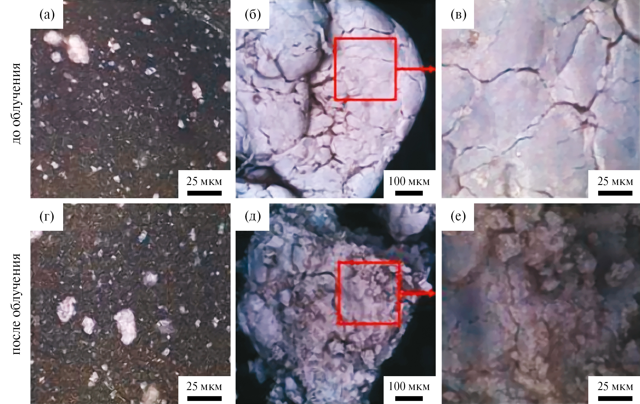 Рис. 3. Поверхность образцов теломеров ТФЭ/ацетон (а, г) и ПТФЭ (б, в, д, е) до и после облучения дозой 600 кГр.