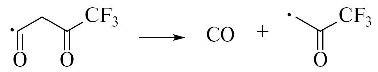 Реакция (2), скорее всего, является главным источником СО в жидком ГФАА. В частности, об одновременном образовании Z1 и Z2 свидетельствуют их близкие выходы (рис. 1). Реакция (2) приводит к более стабильному трифторацетонильному радикалу, который, однако, может иметь несколько изомерных форм: