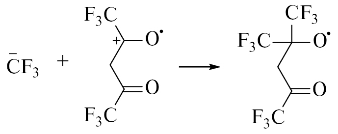 или при распаде возбужденных катион-радикала и анион-радикала. Вместе с тем роль реакции (9) мала из-за эффекта “клетки”, поскольку высокие плотность и вязкость ГФАА замедляют диффузию радикалов от места их образования. Вместе с тем радикал ×СF3 может быть захвачен соседней молекулой ГФАА: