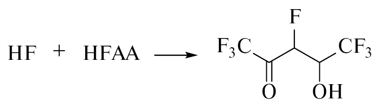 НF может появляться при протонировании F- (например, в присутствии Z3) или в результате прямого элиминирования HF из анион-радикала [18, 20]. Однако гомолитический разрыв одиночной связи в жидкости более вероятен, по сравнению со сложной перегруппировкой, дающей молекулу HF. Радиолиз частично фторированных алифатических соединений, как правило, сопровождается образованием НF по радикальному механизму. Например, при облучении формаля-2 (бис(2,2,3,3,4,4,5,5-октафторпентокси)-метана, C11F16H8O2) выход HF достигает 0.5 мкмоль/Дж [19, 21]. Но формаль-2 состоит из насыщенных связей, а электронная доля F (0.615) и H (0.034) в нем выше, чем в ГФАА (около 0.529 и 0.020 соответственно). Число атомов Н в ГФАА в 3 раза меньше, чем атомов F, и они располагаются в пределах системы сопряжения, т.е. рядом с двойными связями. Таким образом, в формале-2 легкие радикалы преимущественно отщепляют Н, а в ГФАА доминирует их присоединение. НF весьма реакционноспособная кислота, способная присоединяться по двойным связям: