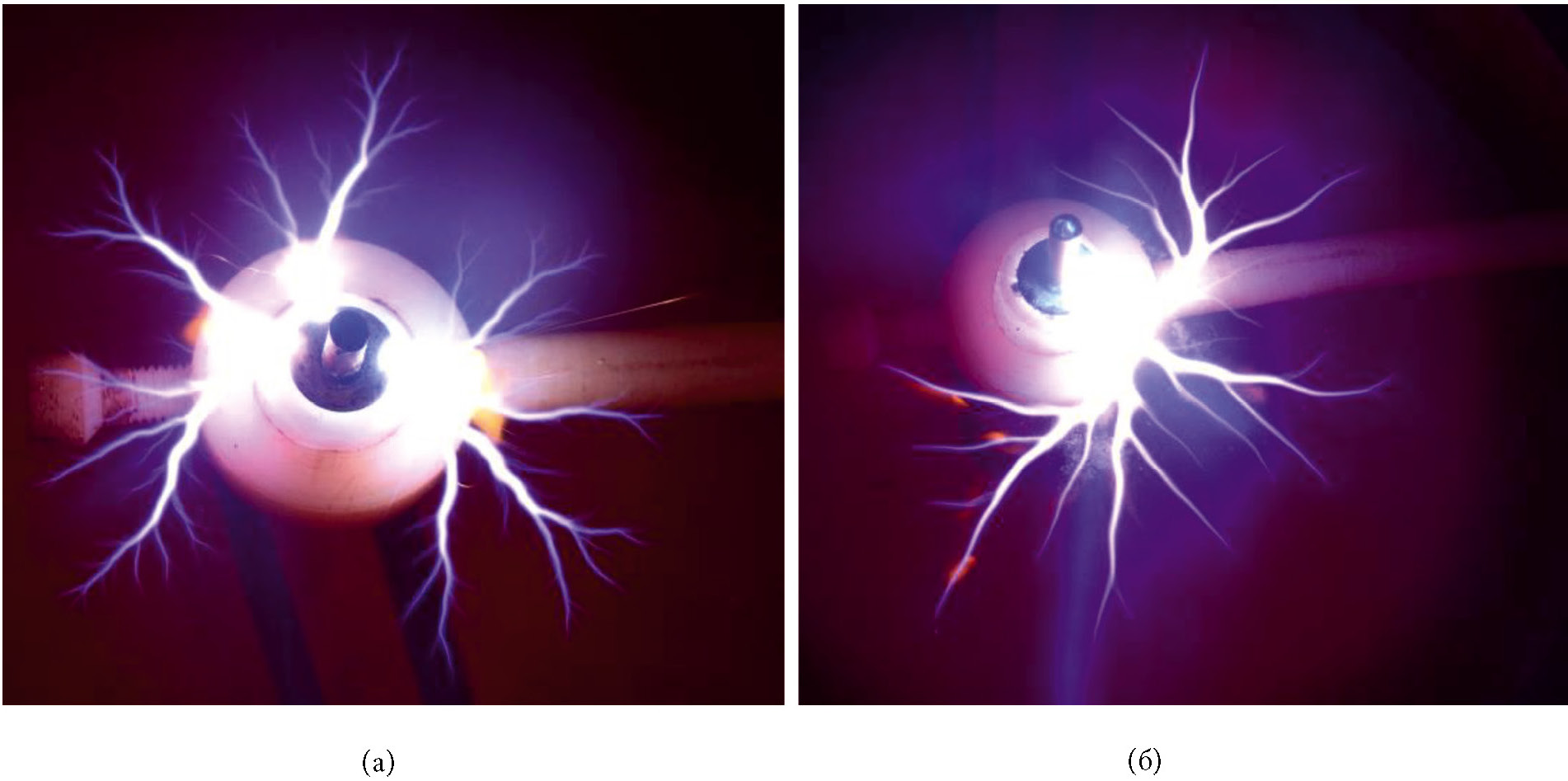 Рис. 3. Фотоизображения разрядов: (а) при отрицательной полярности напряжения на высоковольтном электроде; (б) при положительной полярности.