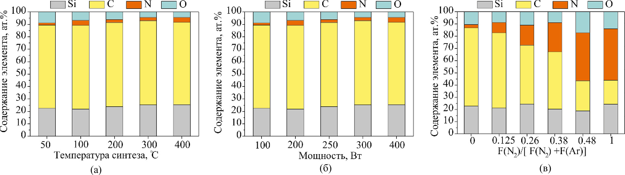 Рис. 4. Зависимость элементного состава пленок от (а) температуры осаждения, (б) мощности плазмы и (в) содержания азота в исходной газовой смеси ГМДС + Ar + N2.