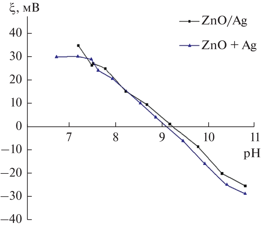 The chemical compositions, structures, and electrokinetic potentials have been studied for silvercontaining Janus-type ZnO/Ag nanoparticles, heterophase Cu/Ag nanoparticles with a uniform distribution of the components over a particle, and silver-decorated TiO2 nanoparticles. The nanoparticles have been obtained by the simultaneous electric explosion of two wires. The influence of nanoparticle surface structure on the isoelectric point position and electrokinetic potential values has been analyzed. The effect of silver localization on the electrokinetic characteristics of nanoparticles has been investigated. These characteristics have been compared with those of mechanical mixtures having the same mass ratios of the components.