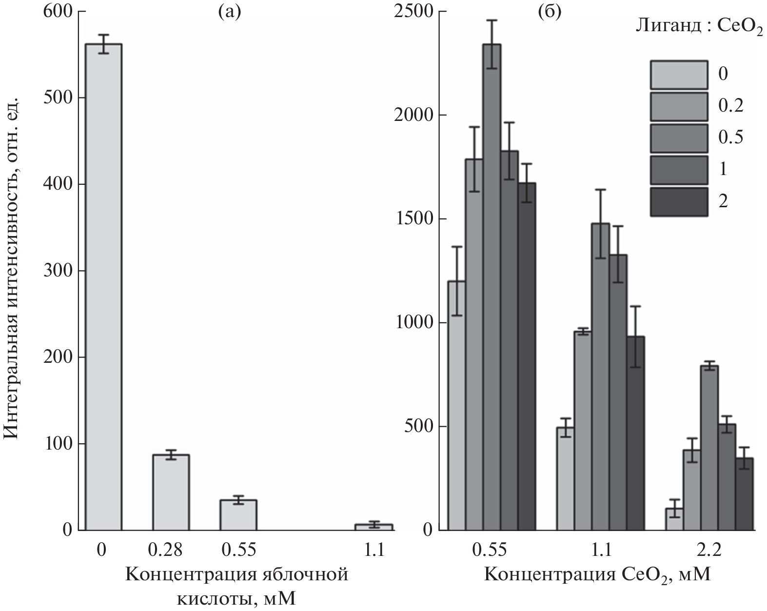 For the first time, stable aqueous colloidal solutions of cerium dioxide stabilized with L-malic acid have been obtained at ligand : CeO2 molar ratios of 0.2, 0.5, 1.0, and 2.0. Using dynamic light scattering, it has been shown that CeO2 sols are characterized by a narrow monomodal size distribution of aggregates, and the sols remain to be aggregatively stable in a Tris-HCl buffer solution. According to the chemiluminescence analysis of the enzyme-like activity of cerium dioxide sols with respect to hydrogen peroxide, the surface modification of the cerium dioxide particles with malic acid increases the enzyme-like activity of СеО2 up to 4.5 times.